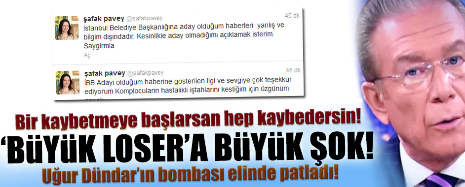 MEDYAGÜNDEM- Bir kaybetmeye başlarsanız çorap söküğü gibi devamı gelir. Medyanın don dönemdeki en büyük “loser’ı” Uğur Dündar dün CHP’nin İstanbul Büyükşehir Belediyesi Başkan adayının Şafak Pavey olduğunu açıkladı, o iddia kesin bir dille yalanlandı. Son olarak Artı Bir televizyonunu “batıran” Uğur Dündar bu kanaldan ayrılmış, tencere tavacıların müptezel kanalı Halk …