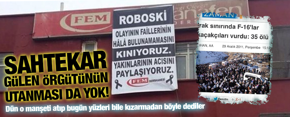 Gülen örgütünün nasıl bir sahtekar yüzü olduğunu net biçimde ortaya koyan iki fotoğraf… Gülen örgütünün dershanelerinden FEM ve Anafen Şırnak Şubesi’nin Uludere Katliamı ile ilgili astığı pankart tepkilere neden oldu. Cemaat’in dershaneleri, Uludere Katliamının yıldönümünde katliamı kınayan bir pankart astı. Ancak, Cemaat’in yayın organı Zaman gazetesi, olayın ertesi günü 29 …