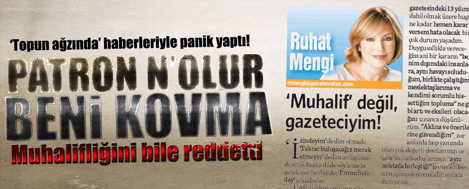 MEDYAGUNDEM.COM- Tam da Mustafa Mutlu’nun kovulduğu dönemde, iki gün önceki yazısında izne ayrıldığını duyurunca medya kulislerinde “Ruhat Mengi de topun ağzında” yorumları yapılmıştı. “Topun ağzında” olmanın stresini kaldıramamış olmalı ki, eş kontenjanından yazar olan Ruhat Mengi, bugün ani bir dönüşle karşımıza çıktı. Vatan’da karı-koca Demirören’den maaş alan Mengi ailesinden Ruhat …