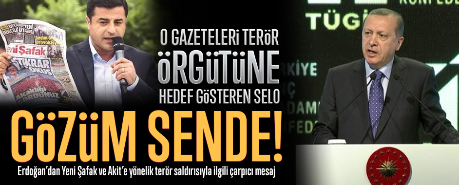 Cumhurbaşkanı Erdoğan Türkiye Genç İşadamları Konfederasyonu (TÜGİK) Genel Kurulu’nda Yeni Şafak ve Yeni Akit’e yönelik terör saldırılarını kınadı. Sözleri şöyle: Türkiye içeride ve dışarıda topyekün bir savaş veriyor. İşte bu sabah İstanbul’da iki gazetemizin Yeni Şafak ve Yeni Akit’in binalarına molotof kokteyli ve silahlı saldırıda bulunuldu. Hamdolsun can kaybı yok. …