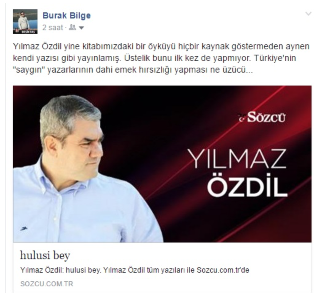Sözcü gazetesi yazarı Yılmaz Özdil, dünkü köşesinde yer alan hikayeyi “Babamı Beklerken” isimli kitaptan intihal yapmış. MEDYAGUNDEM.COM- Sözcü Gazetesi yazarı Yılmaz Özdil, gazetenin dünkü sayısında yer alan “Hulusi bey” başlıklı yazısının, intihal olduğu ortaya çıktı. Yazarın, makalesinin büyük bölümünü 2013 yılında yayınlanan Vatan Gazetesi eski İstihbarat ve Haber Araştırma Servisi …