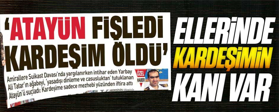 Paralel yapı tarafından amirallere suikast davasında sanık haline getirilince canına kıyan Yarbay Ali Tatar’ın abisi: Ellerinde kardeşimin kanı var. Yurt Atayün kardeşimi mezhebine göre fişleyip hayatımızı kararttı. 4 yıldır bu acıyla yaşıyoruz. Paralel yapı operasyonları, amirallere suikast davasında yargılanırken “Hukuksuzluk sürecine hukuk adına saygı gösterilemez” diyerek intihar eden Deniz Yarbay …