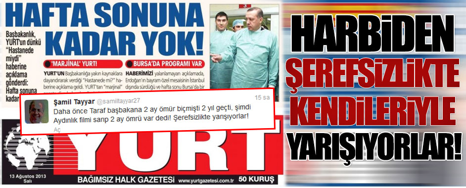 MEDYAGUNDEM.COM- Dün Twitter’da Ak Parti Gaziantep Milletvekili Şamil Tayyar şöyle yazmıştı: “Daha önce Taraf Başbakana 2 ay ömür biçmişti 2 yıl geçti, şimdi Aydınlık filmi sarıp 2 ay ömrü var dedi! Şerefsizlikte yarışıyorlar!” Tayyar gerçekten haklı, şerefsizlikte artık kendisiyle yarışan bir gazete varsa o da Yurt. Dün Başbakan Recep Tayyip …