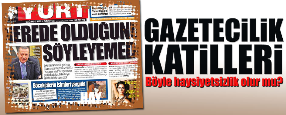 MEDYAGUNDEM.COM- Soysuzluk, haysiyetsizlik, yalan ve iftiradan medet umar hale gelen çukur yayıncılık… Hepsini toplayın Yurt denilen CHP’nin marjinal gazetesinde göreceksiniz. Başbakan Erdoğan’ın sağlığıyla ilgili ortaya attıkları yalanla utanmaları gerekirken, bugün Yurt haysiyetsizlikte sınır tanımadığını gösterdi. Bugün manşetinden ”Nerede olduğunu söyleyemedi” diye başlık atan Yurt, Başbakan Erdoğan’ın dün Türkmenistan gezisi öncesi …