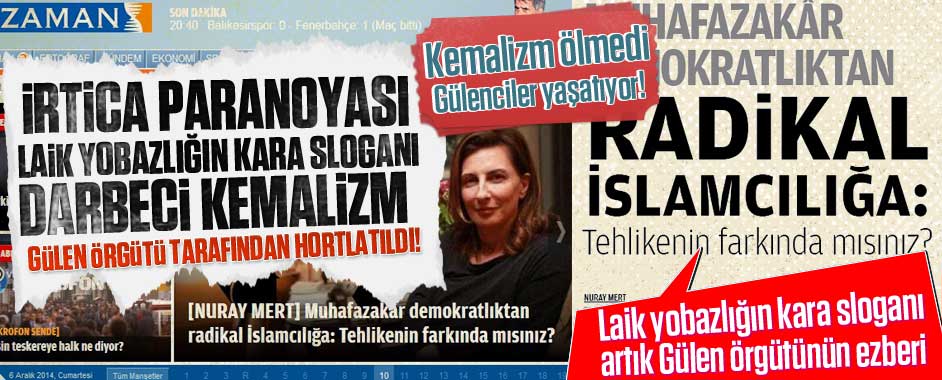 Laik yobazlığın kara sloganı; “Eyvah irtica, tehlikenin farkında mısınız”, artık “dini cemaat” görünümlü Gülen örgütünün de yeni ideolojisine dönüştü. “Dindar maskeli” Gülen örgütü, “din dışılığı” savunan kemalizmle “muta nikahı” kıydı. Ve veled-i zinalarından biri de bugün Zaman gazetesinde peydahlandı! MEDYAGUNDEM.COM- Gülen örgütünün ana gazetesi Zaman’da bugün yayınlanan bir yazı, paralel …