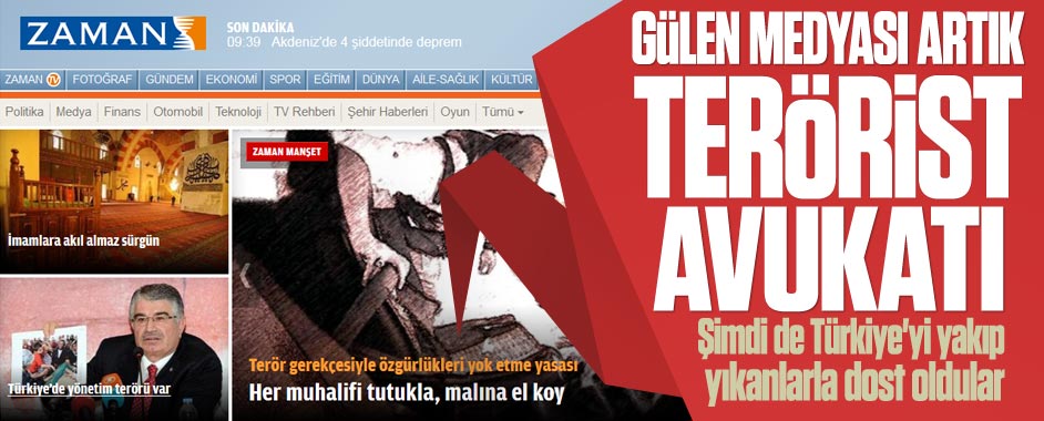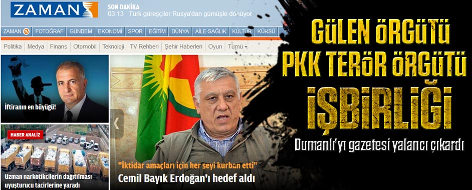 MEDYAGUNDEM.COM- Gülen örgütü Cumhurbaşkanı Erdoğan’a düşmanlıklarından terör örgütü PKK’ya bile umut bağladı. Zaman gazetesinin internet sitesi manşetinden terör örgütü PKK’nın yöneticilerinden Cemil Bayık’ın Erdoğan aleyhindeki sözlerini manşetine çekmekle kalmadı, PKK bayrağını da yayınlayarak terör örgütünün reklamını yaptı. Erdoğan düşmanlığından şeytanla bile yatağa giren Gülen örgütünün PKK ile birlikte işbirliği yapması …