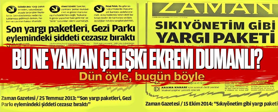 Paralel devlet yapılanmasının sözcüsü olduğu iddia edilen Zaman Gazetesi, yayınladığı haberlerinde kendisiyle çelişmeye devam ediyor. Paralel devlet yapılanmasının sözcüsü olduğu iddia edilen Zaman Gazetesi, yayınladığı haberlerinde kendisiyle çelişmeye devam ediyor. 2013 Temmuz’unda; “Son yargı paketleri, Gezi Parkı eylemindeki şiddeti cezasız bıraktı” diyen Zaman Gazetesi; AK Parti Hükümeti’nin şiddete karışanların cezalandırılmasına …