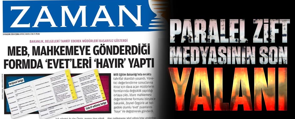 Zaman gazetesinin bugünkü manşet haberi Milli Eğitim Bakanlığı tarafından yalanlandı. Zaman’ın haberinde “MEB, tahrif edilmiş belgelerle müdürleri başarısız gösterdi; Formlardaki ‘Evet’leri ‘Hayır’ yapıp mahkemeye gönderdi” denilerek, Milli Eğitim Bakanlığının mahkemeye gönderilen belgeleri tahrif ettiğini iddia ettiler. Ancak Milli Eğitim Bakanlığı yaptığı açıklamayla haberi yalanladı. İşte MEB’in açıklaması: Zaman gazetesinde “Bakanlık, …