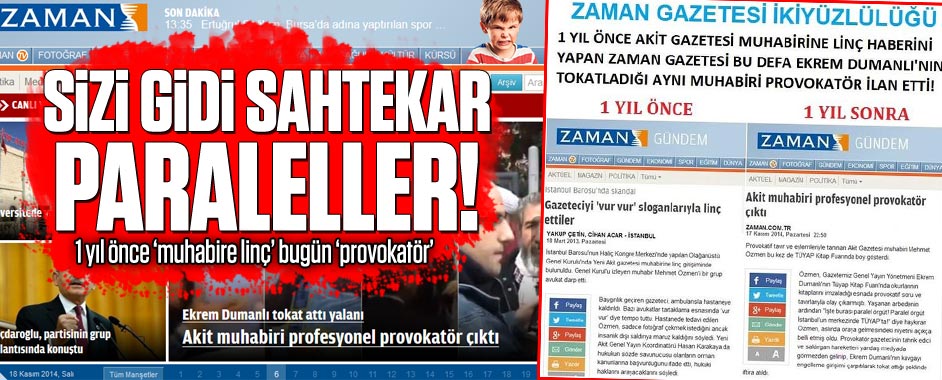 Ekrem Dumanlı tarafından saldırıya uğrayan Akit muhabiri Mehmet Özmen bir de Zaman gazetesi tarafından “profesyonel provokatör” ilan edildi. Oysa Zaman gazetesi, “provokatör” diye suçladığı muhabir için bir yıl önce “muhabire linç” demişti. Zaman yine ikiyüzlülüğü ve paralel sahtekarlığı ile yakalandı. MEDYAGUNDEM.COM- Zaman gazetesi genel yayın yönetmeni Ekrem Dumanlı Yeni Akit …