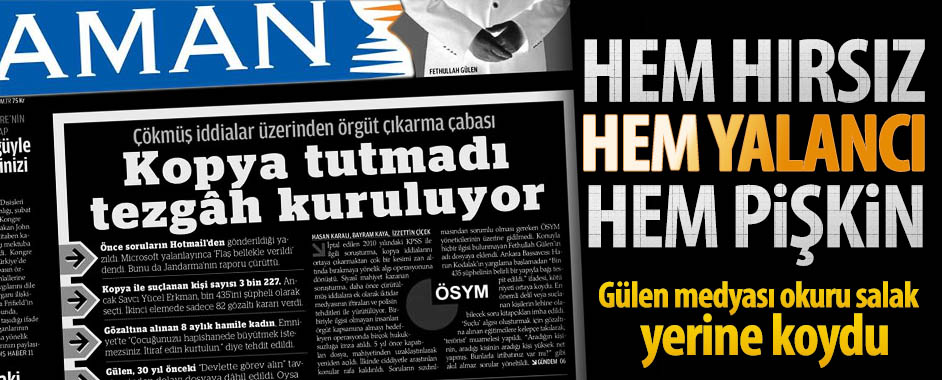 Zaman Gazetesi, 2010 KPSS’de kopya çekilip haram yiyen yandaşlarını savunayım derken fena çuvalladı. KPSS ile hiç alakası olmamasına rağmen avukatlıktan hakim savcılığa geçiş sınavında birinci olanların kendilerinden olmadığını iddia edip gülünç duruma düştü. KPSS kopyacılarını savunmakta zorlanan paralel yapının amiral gemisi Zaman bugün akıllara ziyan bir haberle adeta gülünç duruma …