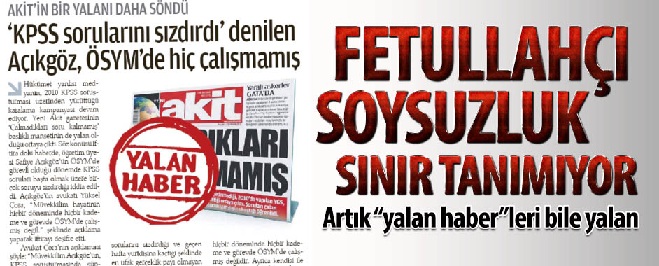 Zaman Gazetesi, Yeni Akit’te yayımlanan “Çalmadıkları soru kalmamış” başlıklı manşet haberimi yalanlamaya çalışırken yeni bir yalana başvurdu. Zaman Gazetesi; 16 senedir ÖSYM’de çalışan ve şube müdürü olan Safiye Açıkgöz’ün ÖSYM’de hiç çalışmadığını iddia ederek büyük yalana imza attı! ZAMAN GAZETESİ; 16 SENEDİR ÖSYM’DE ÇALIŞAN ŞUBE MÜDÜRÜNÜN ÖSYM’DE ÇALIŞMADIĞINI YAZDI! ÖSYM’deki …