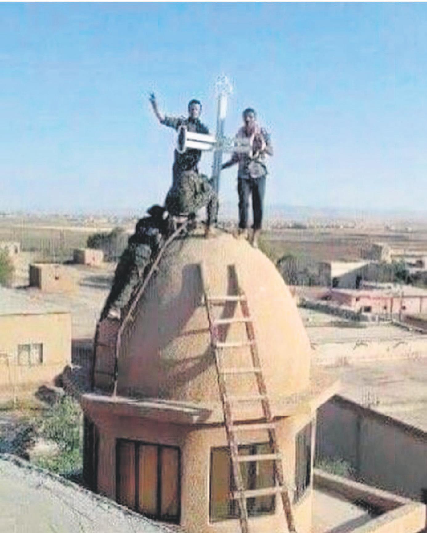 Üst akıl hain planları için kol kola girdi. Terör örgütü PKK’nın Suriye’deki uzantısı olan YPG, ABD ve Avrupa’nın gözdesi haline geldi. Yabancı askerler, YPG’nin içinde cirit atmaya başladı. Özellikle Amerikan ve İngiliz askerleri, terör örgütüne destek vermek için tüm imkanlarını seferber etti! Hatta YPG’nin ele geçirdiği noktalarda İngiliz ve Amerikan bayrakları eksilmedi. ABD askerleri omuzlarına YPG arması takıp terör örgütü DAEŞ’e yönelik operasyonlar yürüttüğünü söyledi. Suriye’deki bu akıllara durgunluk veren karanlık oyunlara bir yenisi daha eklendi. Terör örgütü YPG’nin kol gezdiği noktalarda haçlar yükseldi! Kan lobisinin uşağı olan YPG’li teröristler Suriye’nin Haseke kentinde bir caminin minaresinin kubbesine haç dikti. Ardından o kubbeye çıkıp fotoğraf çektirdi.
