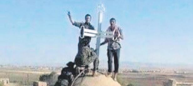 YPG’lilerin haç yerleştirdiği noktalardan biri de Kobani’ydi. O bölgede olan YPG’liler haç’ın önünde böyle poz verdi.