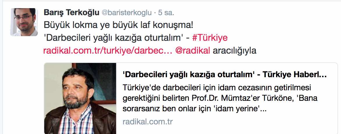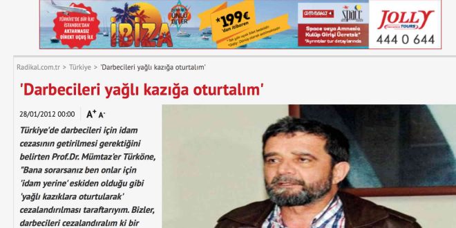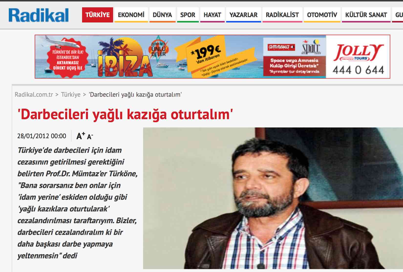 Gözaltına alınan FETÖ’nün kalemşörlerinden Mümtazer Türköne, 2012 yılında “darbecileri yağlı kazığa oturtalım” demişti. Şimdi Türköne FETÖ’cü darbenin işbirlikçilerinden biri. Şimdi kamuoyu Türköne’nin “yağlı kazığı” önce kendisinin tecrübe etmesini bekliyor. Bakın Radikal’de yer alan haberle o gün ne demişti: