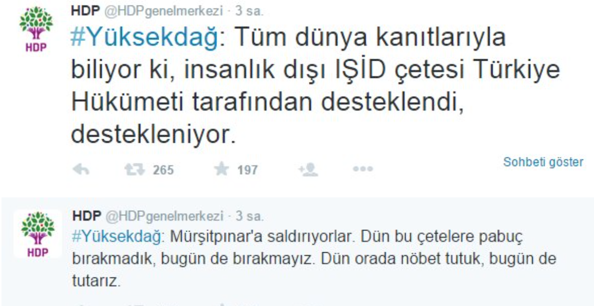 HDP’den ise konuyla ilgili provokatif açıklamalar geldi. HDP Eş Genel Başkanı Figen Yüksekdağ, IŞİD’in Türkiye üzerinden Kobani’ye geçtiğini iddia etti, partililer Twitter’da da #TerroristTurkey hastag’i açtı.