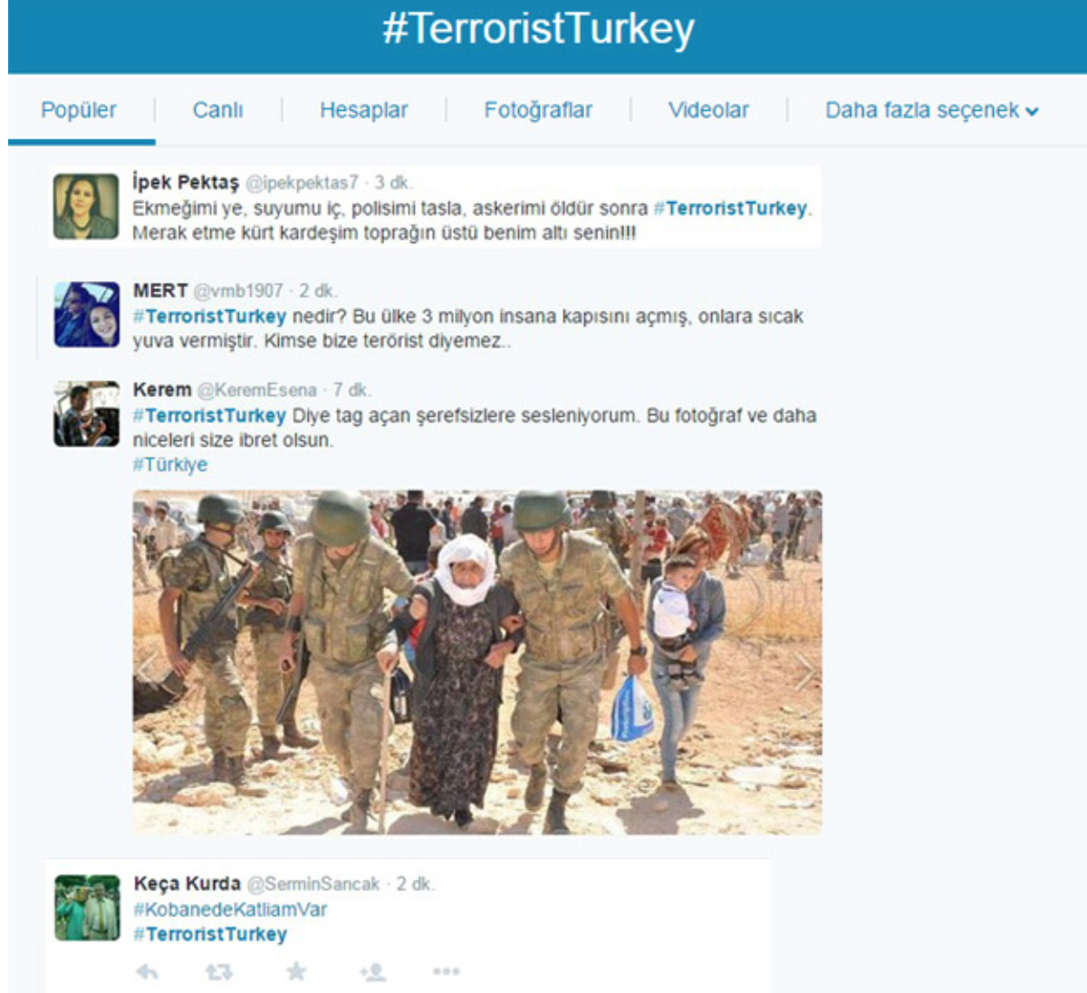 “#TerroristTurkey” hashtagiyle açılan başlığı kısa süre TT listesinin ilk sırasına taşıyan trollere büyük tepki yağdı. Hemen sonrasında ise açılan “#NeMutluTürküzDiyene” ve “TeröristPKK YPG” başlıkları ikinci ve üçüncü sıraya kadar çıktı.