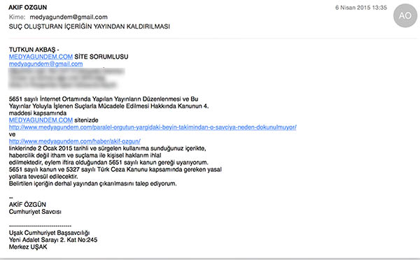 Halen Uşak savcısı olan Akif Özgün’den MEDYAGÜNDEM’e bir elektronik posta geldi. “İçeriğin kaldırılması” şeklindeki sözde talepte savcı Akif Özgün, “adalet.gov.tr” uzantılı e-posta adresini kullandı. Mesajında MEDYAGÜNDEM’in sahibi Tutkun Akbaş’ın ev adresi ve kimlik bilgilerini de yazarak paralel savcı usullere aykırı davranıp skandal biçimde de üstü örtülü tehditte bulundu.