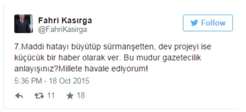 “Dünkü sürmanşette ‘Sen misin yol vermeyen’ başlığıyla aktarılan 88 TL’lik trafik cezasının kesilme gerekçesinde bir kasıt olduğu ortada. Makbuzda yazılan gerekçe: ‘Sayın Cumhurbaşkanı Genel Sekreteri’ni tehlikeye düşürmek.’ Ama böyle bir trafik suçu yok. Ceza kural ihlalinden ya da trafiği tehlikeye atmaktan kesilmiş olmalı. Gerekçeyi doğru yazmama sebebi, ya cehalet ya kumpas! Hürriyet, Cumhurbaşkanlığını karalama adına söz konusu maddi hatayı görmezlikten geliyor; paralel işi bir makbuzla, bana yükleniyor. Dün makbuzu sürmanşetten veren Hürriyet, bugün ise KKTC’ye anavatandan su götüren dev projeyi neredeyse görmemezlikten geliyor. Maddi hatayı büyütüp sürmanşetten, dev projeyi ise küçücük bir haber olarak ver. Bu mudur gazetecilik anlayışınız?”