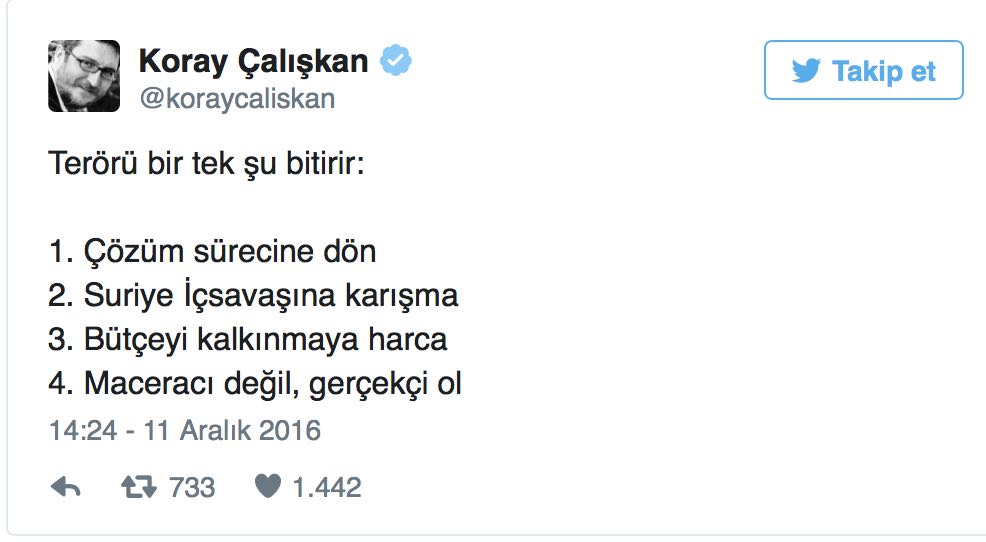 Koray Çalışkan, Twitter sayfasından Beşiktaş’ta yaşanan terör saldırıyla ilgili ilginç bir paylaşımda bulundu. Terörün bitirilmesi konusunu Suriye’nin içsavaşına bağlayan Çalışkan, çözüm sürecine dönülmesi gerektiğini iddia etti.