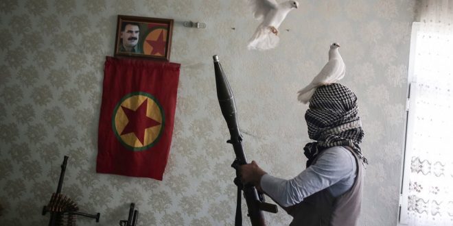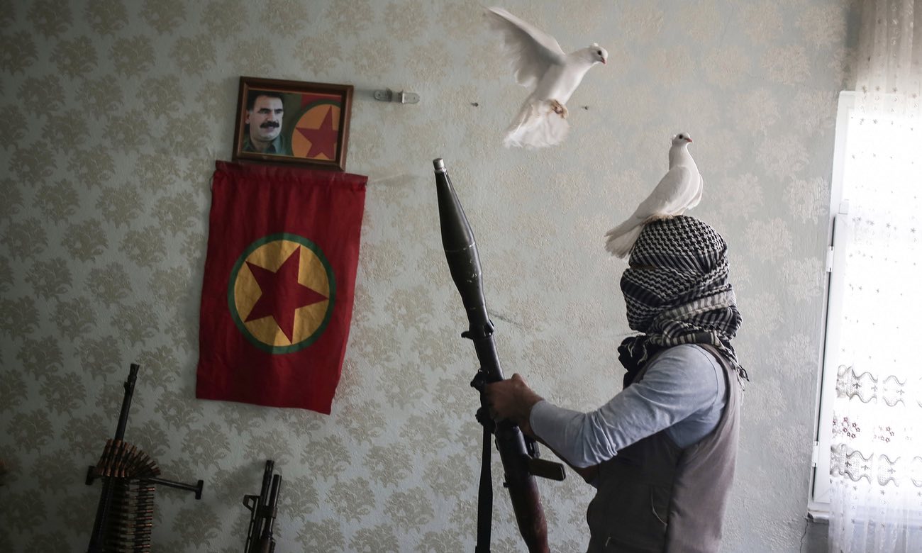 Fotoğraftaki beyaz güvercinlere vurgu yapılarak barışı ön plana çıkarmaya çalışan Guardian, PKK’lı teröristin elindeki roketatar ve önünde duran silahlara rağmen güvercinli terörist fotoğrafını barışçıl gösterdi.