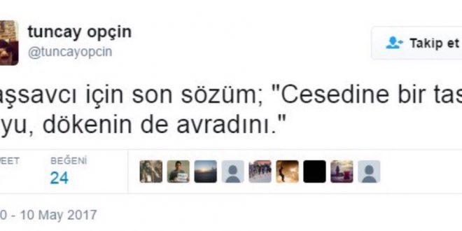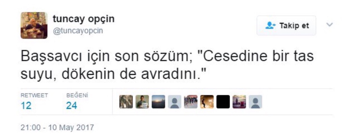 15 Temmuz darbe teşebbüsünü bir gün önce FETÖ’cülere duyuran, FETÖ’nün firari kalemi Tuncay Opçin, Twitter hesabı üzerinden bu kez trafik kazasında hayatını kaybeden, FETÖ iddianamesini yazan Denizli Cumhuriyet Başsavcısı Mustafa Alper’e kendisinden beklenen sözlerle saldırdı: