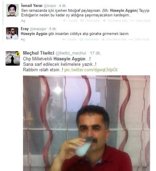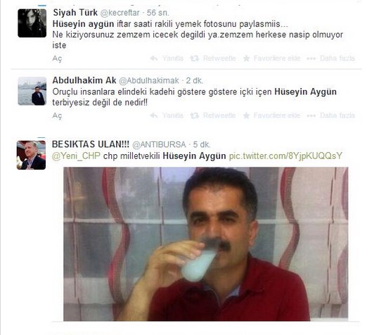CHP Tunceli milletvekili Hüseyin Aygün’den büyük saygısızlık. CHP’nin Alevi vekili Hüseyin Aygün twitter’da Beşiktaş’ta yaşanan olaya gönderme yapmak için iftar vakti rakı sofrasında fotoğraf paylaştı. Ramazan ayının ilk günlerinde CHP’li Muharrem İnce de Bodrum’da bira içerken TAKVİM’e yakalanmıştı.