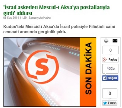 İsrail askerlerinin Mescid-i Aksa’yı işgal etmesine Gülen Cemaatini’nin yayın organı samanyoluhaber.com garip bir şekilde yayınladı. 09.50’de Türk medyasında son dakika olarak geçen gelişmeyi 11.29’da haberleştiren Samanyolu Haber, İsrail askerlerinin Mescid’i Aksa’yı işgal etmesini ‘iddia’ olarak yayınladı.