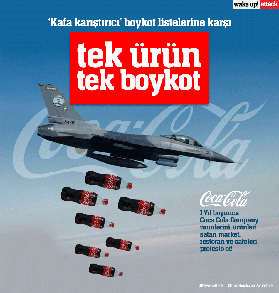 Aslinda tüm Amerikan ve israili destekleyen devletlerin ürünlerini boykot etmek gerekiyor.Bunu yazarkende icim rahat “kesinlikle ne alip kullaniyorum nede yiyorum”.Türkiyedeki televizyon kanallarinda “iftar sofralarinda cola reklami”varmi?.Ben baktigimda avrupadaki türk kanallarina hem uzun masalara hazirlanmis iftar sofralarinda yada anadolu sofralarinda cola ile oruc bozuyorlar.Böyle bir rezalet olurmu?Oruc bozulrken ya hurma yada zeytin ile bozulmazmi oruc yada su ile.Cola ile dini ibadetlerimizi bile amerikanlastirip,sulandiriyorlar.Bence hemen kaldirilmali bu reklamlar.