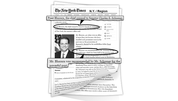 Preet Bharara’nın Charles Schumer’e danışmanlık görevi verdiği sır değil. Zaten Bharara savcılık görevine getirildikten sonra, New York Times gazetesi bu gelişmeyi “(Senatör) Schumer’in tavsiyesi ile oldu” şeklinde haberleştirmişti.