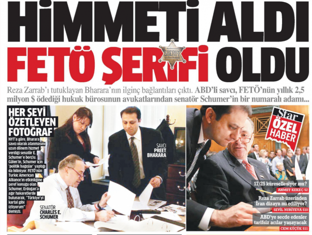 Türkiye’yi ABD’ye şikâyet eden mektubun imzacıları senatörler, Preet Bharara bağlantılı baş imzacı Charles “Chuck” E. Schumer da dâhil, bu olaydan kısa bir süre sonra FETÖ’nün bir çatı organizasyonu olan Turkic American Alliance’ın ‘Turkic American Convention’ adlı bir etkinliğe katıldılar. Charles “Chuck” E. Schumer her yıl düzenlenen etkinliğe bu yıl da ‘şeref konuğu’ olarak katıldı ve Cumhurbaşkanı Erdoğan hakkında ağır hakaretlerde bulunarak “Türkiye’yi kartal gibi izliyorum” ifadelerini kullandı. Reza Zarrab hakkında tutuklama kararı çıkaran savcı Preet Bharara’nın Paralel Çete’den ‘rüşvet’ alan senatörlerin başını çeken Charles “Chuck” E. Schumer ile yakınlığı işte tüm bu gerçeklerle ispatlandı ve Preet Bharara’nın ‘görevlendirilmiş’ ABD’li Zekariya Öz olduğunu kanıtladı.