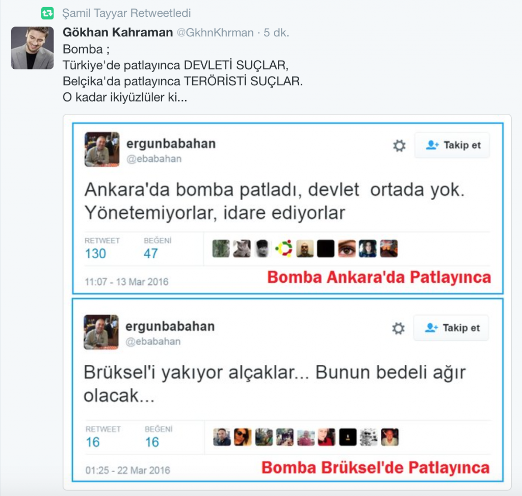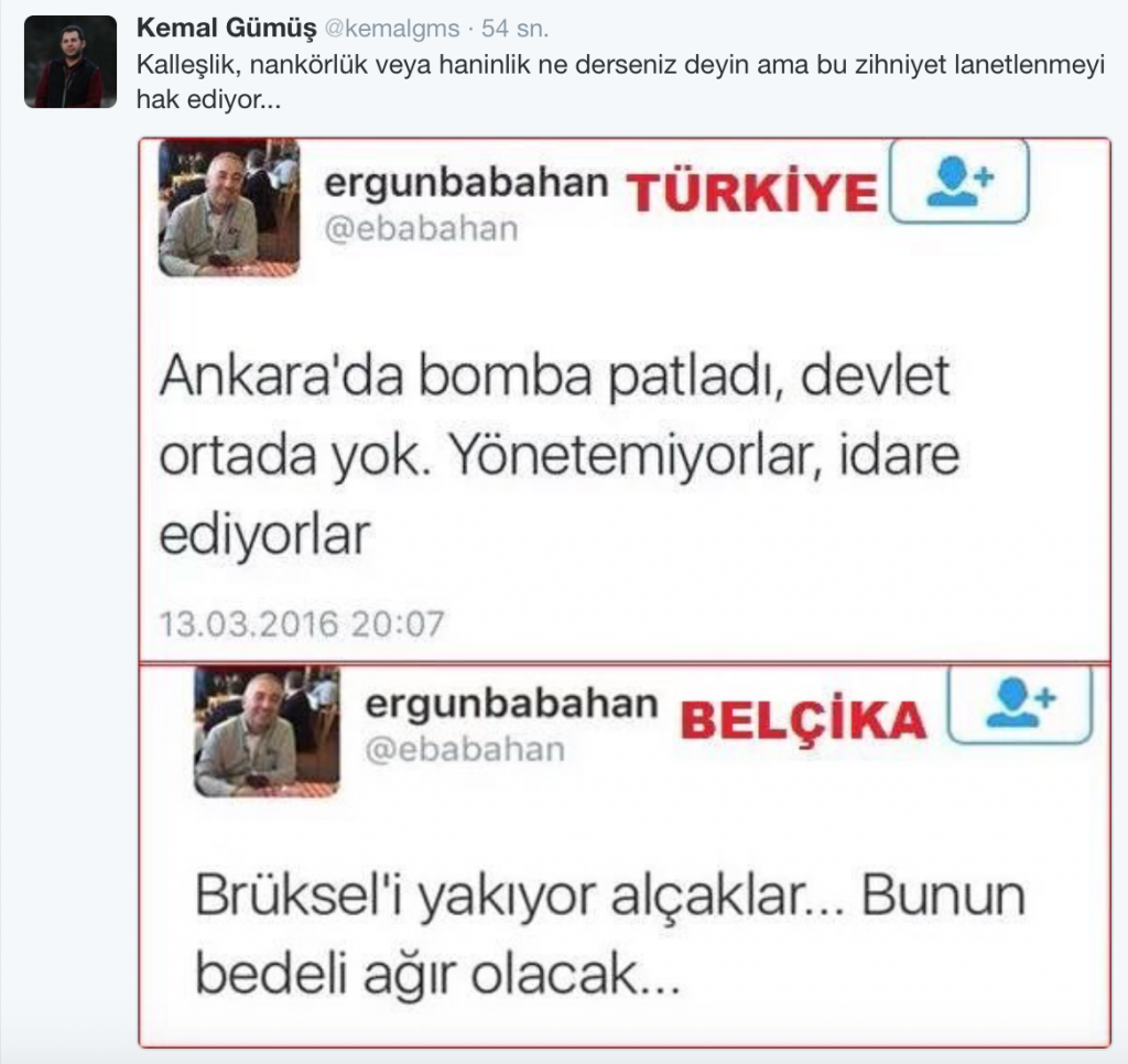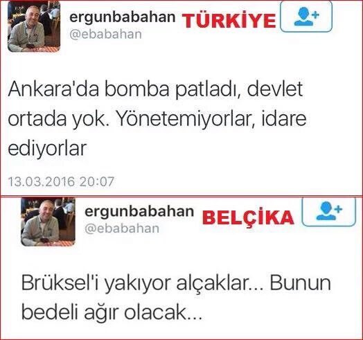 FETÖ’cülük insanlığın lanetlediği, insanı esfel-i safilin yapan bir hastalık…. İşte FETÖ’nün devşirip tetikçi yaptığı gazeteci kılıklı şu adamın hali… Türkiye’de bomba patladığında attığı tweet ile Belçika’dakine verdiği tepki, neyle izah edilir acaba?
