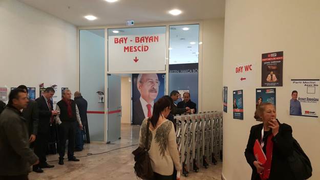Her ayrıntının düşünüldüğü Ankara Arena Spor Salonu’ndaki kurultay organizasyonunda bir tek namaz kılacak olanlar düşünülmedi. Kurultay salonunun alt katında yan yana bulunan bay ve bayan mescidinin kapıları, üzerinde “Üreten, hakça bölüşen, çağdaş ve özgür Türkiye’yi biz kuracağız” ifadelerinin yer aldığı Kılıçdaroğlu posteriyle kapatıldı. Namaz kılmak için gelen misafirler, Kılıçdaroğlu posteriyle kapatılan mescid kapısından geri döndüler.