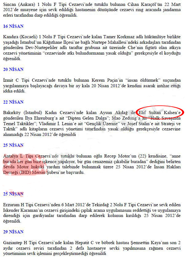 CHP, “Örgüt propagandası yapmak” suçlamasıyla cezaevinde bir süre tutuklu kalan Elif Sultan Kalsen’e gönderilen ve cezaevi yönetimince uygun bulunmayarak kabul edilmeyen kitaplardan dolayı 2012 yılında Kalsen’e “Nisan ayı İnsan Hakları ihlalleri raporununda” mağdur sıfatıyla yer vermiş.