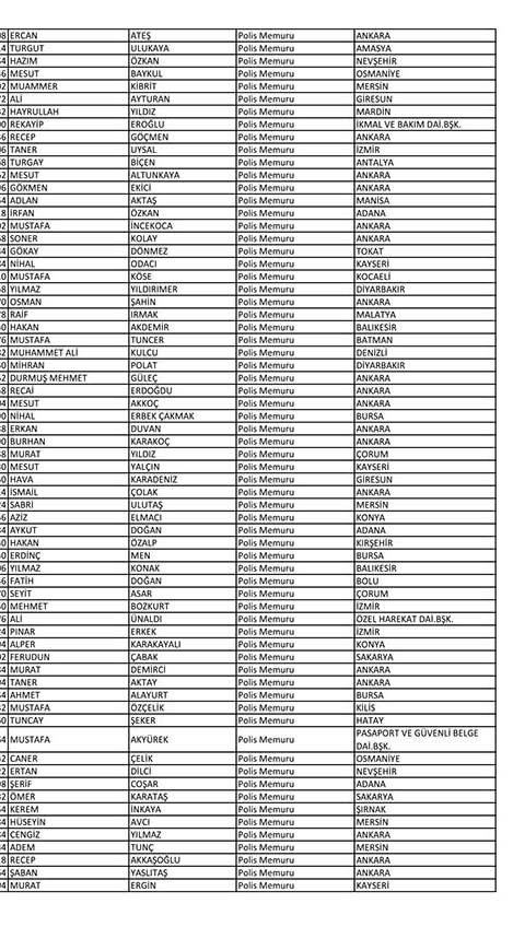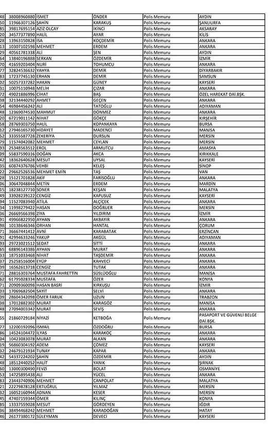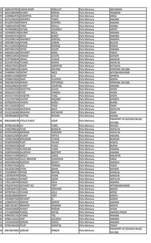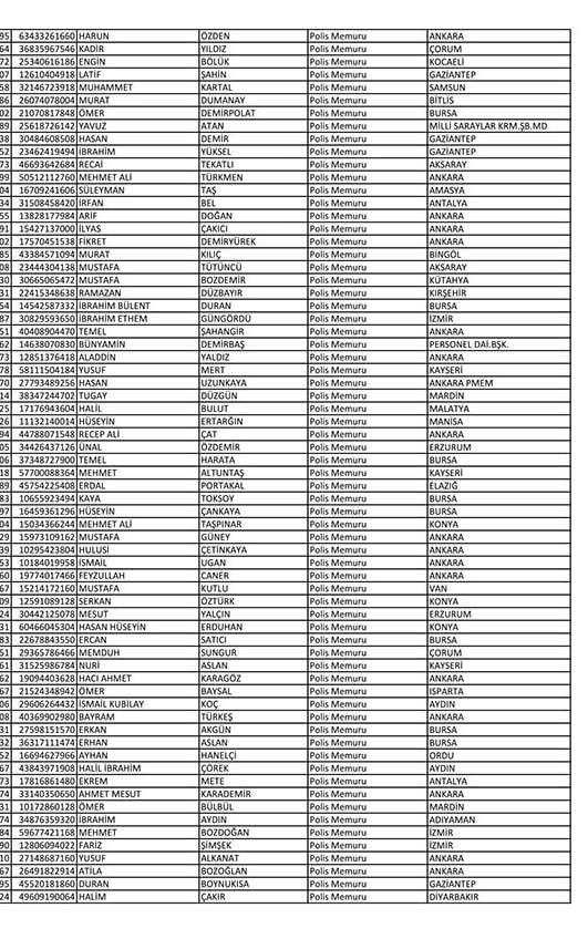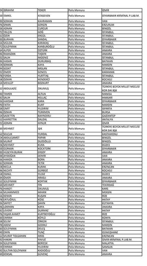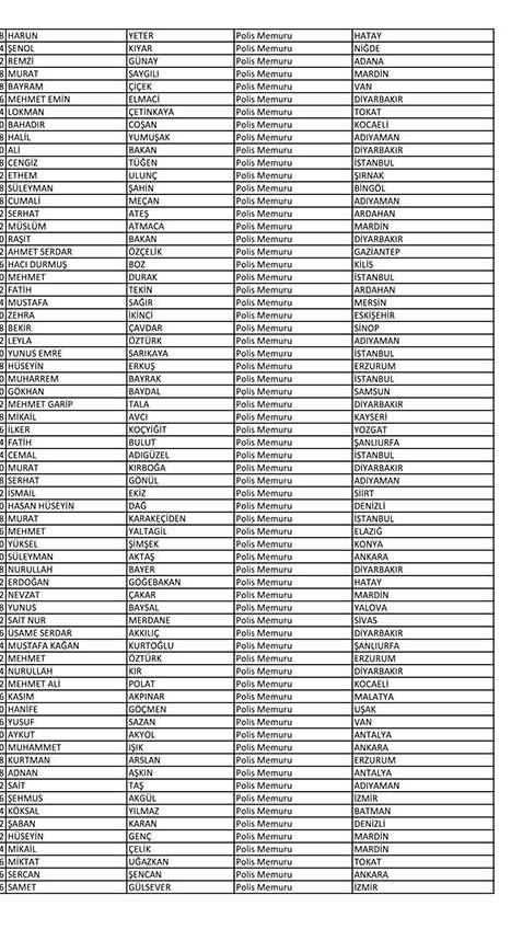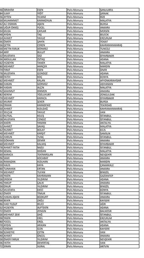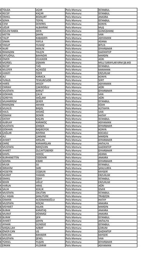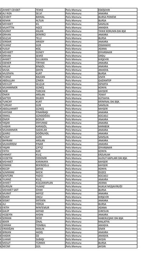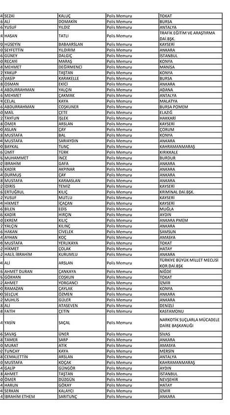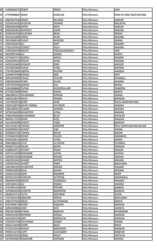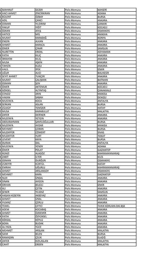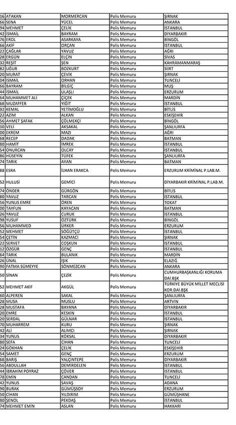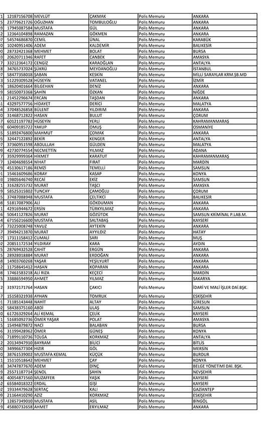 Emniyet Genel Müdürlüğü’nün kararıyla açığa alınan 9 bin 103 polisin isimleri belli oldu. Açığa alınanlardan 115’i emniyet müdürü. Listede 60 emniyet amiri de bulunuyor. Polislerden 2 bin 500’ü İstanbul’da bin 350’si Ankara’da görev yapıyordu. İşte il il açığa alınan polislerin tam listesi.
