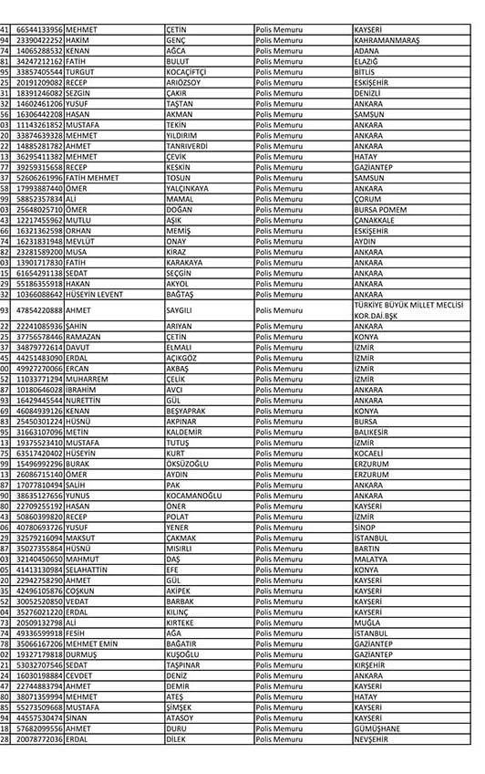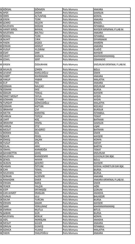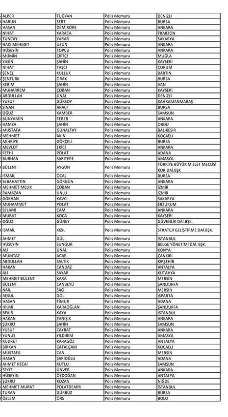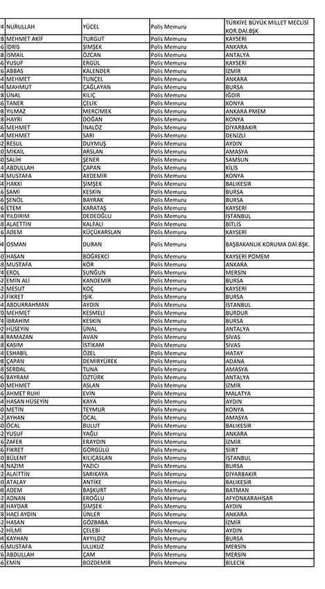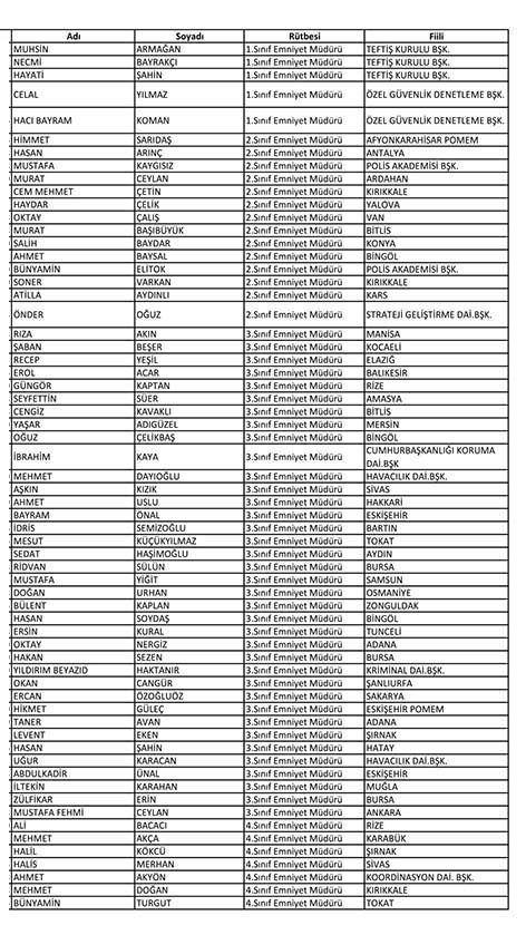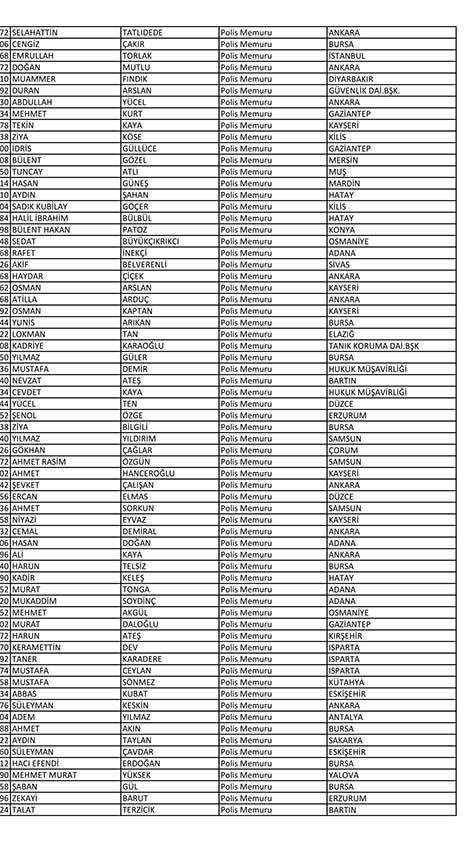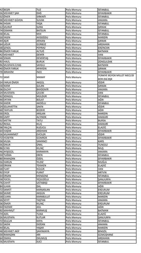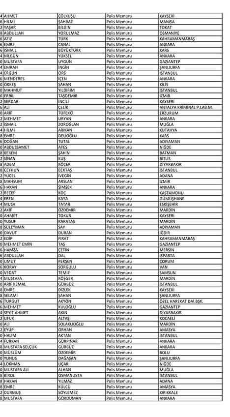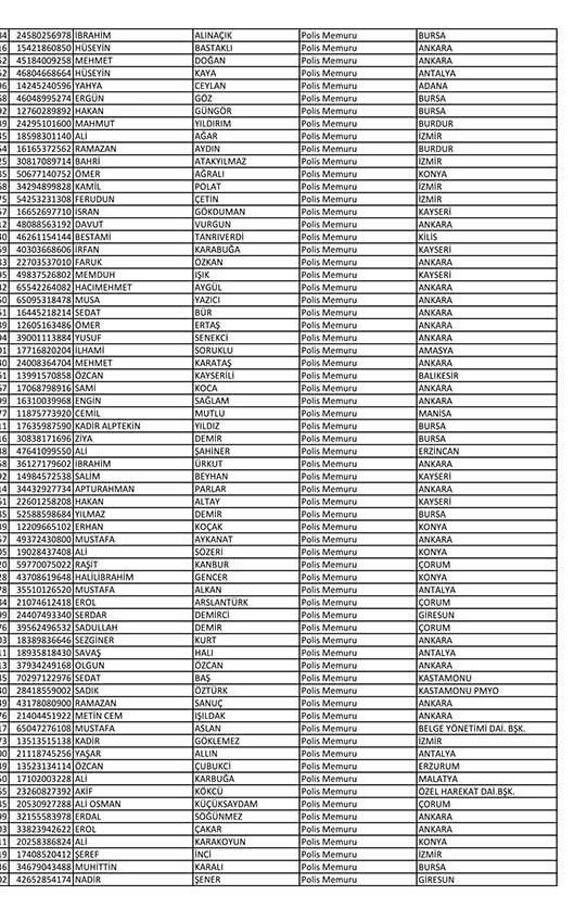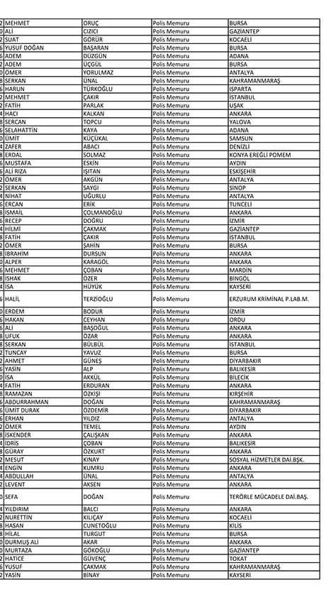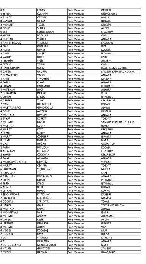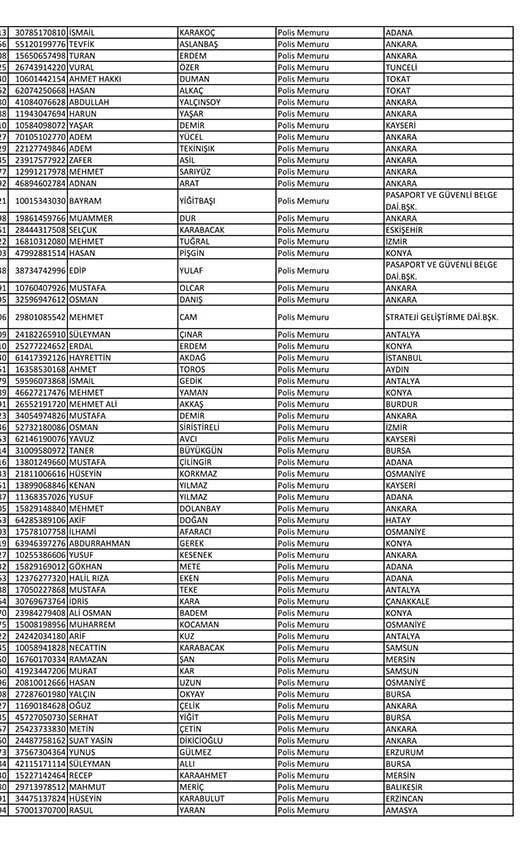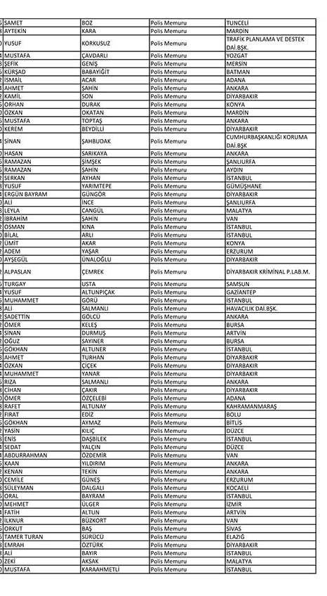 Emniyet Genel Müdürlüğü’nün kararıyla açığa alınan 9 bin 103 polisin isimleri belli oldu. Açığa alınanlardan 115’i emniyet müdürü. Listede 60 emniyet amiri de bulunuyor. Polislerden 2 bin 500’ü İstanbul’da bin 350’si Ankara’da görev yapıyordu. İşte il il açığa alınan polislerin tam listesi.