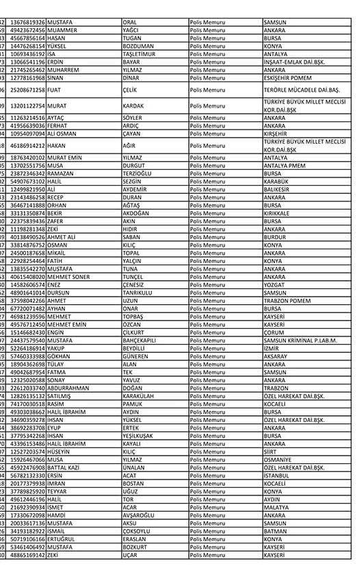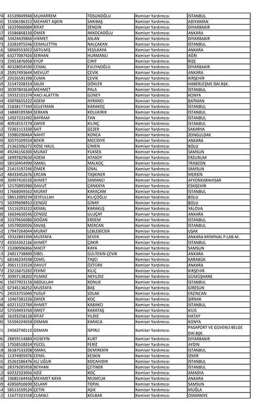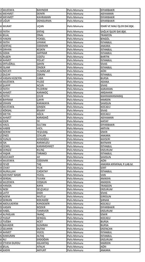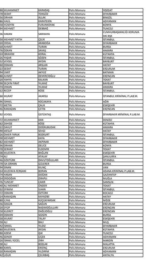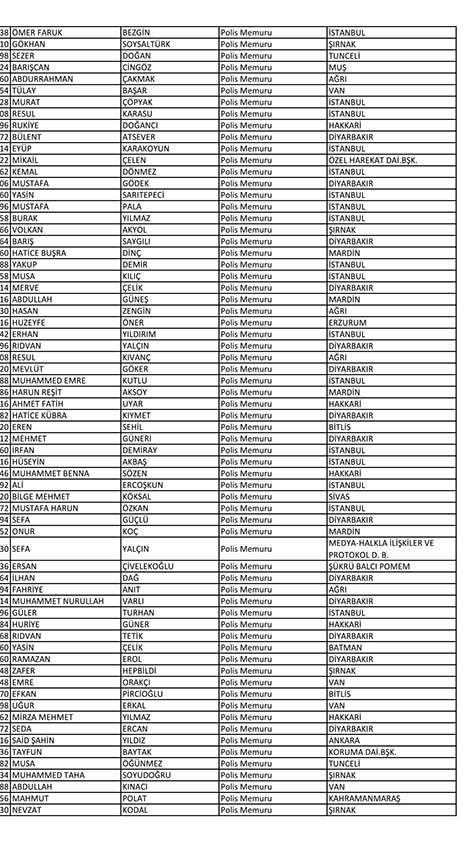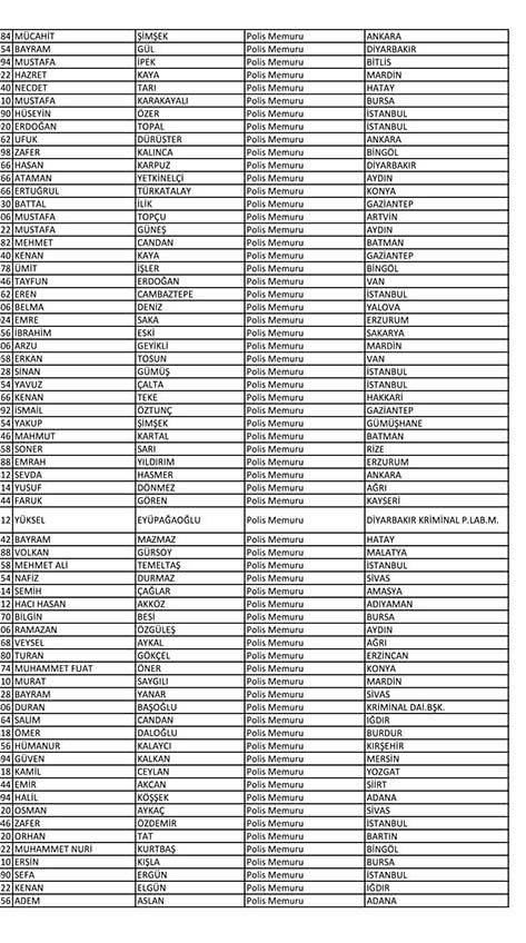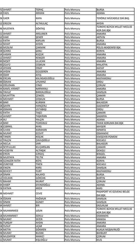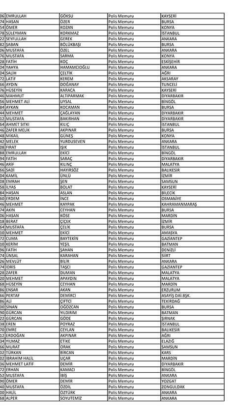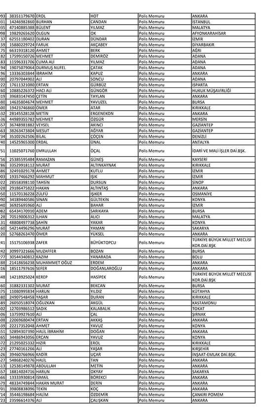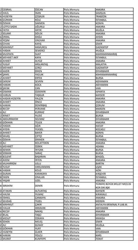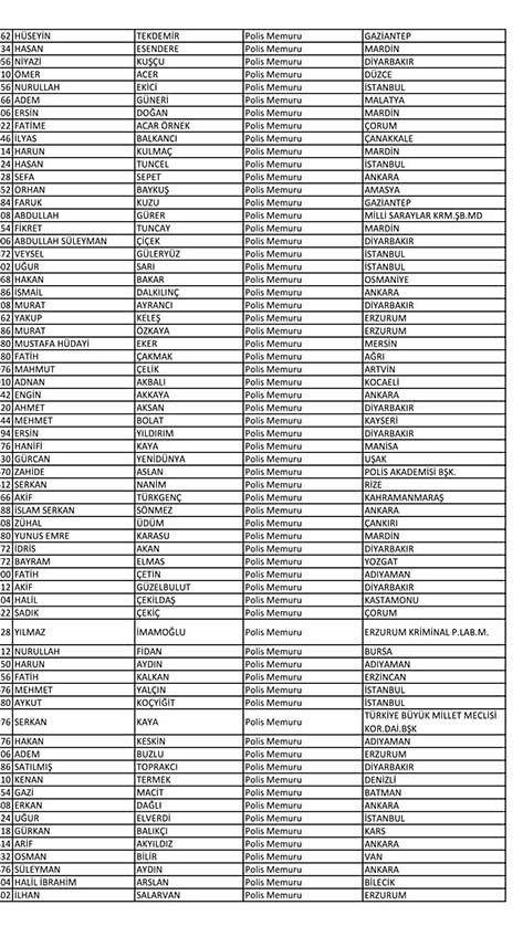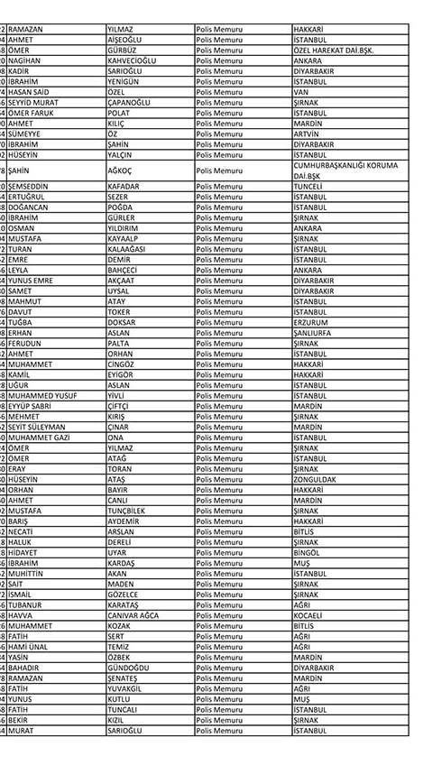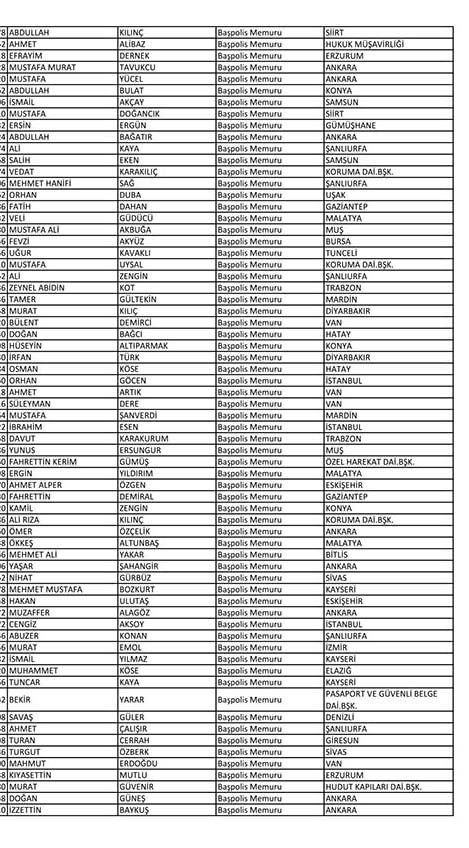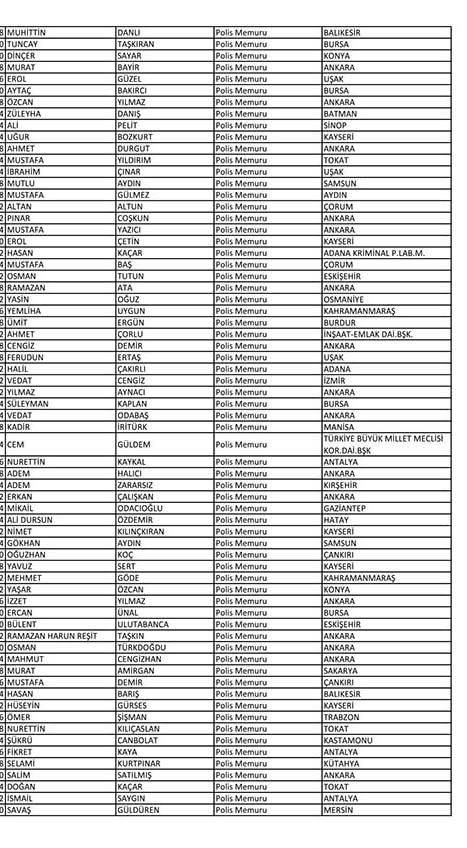 Emniyet Genel Müdürlüğü’nün kararıyla açığa alınan 9 bin 103 polisin isimleri belli oldu. Açığa alınanlardan 115’i emniyet müdürü. Listede 60 emniyet amiri de bulunuyor. Polislerden 2 bin 500’ü İstanbul’da bin 350’si Ankara’da görev yapıyordu. İşte il il açığa alınan polislerin tam listesi.