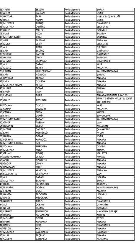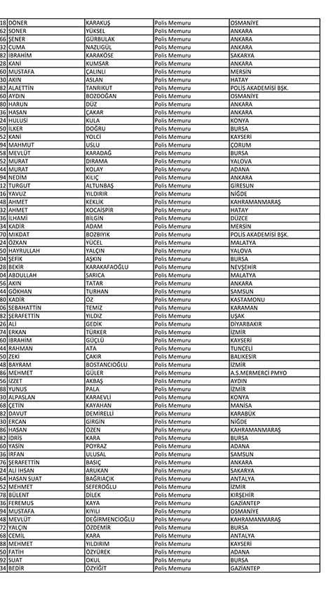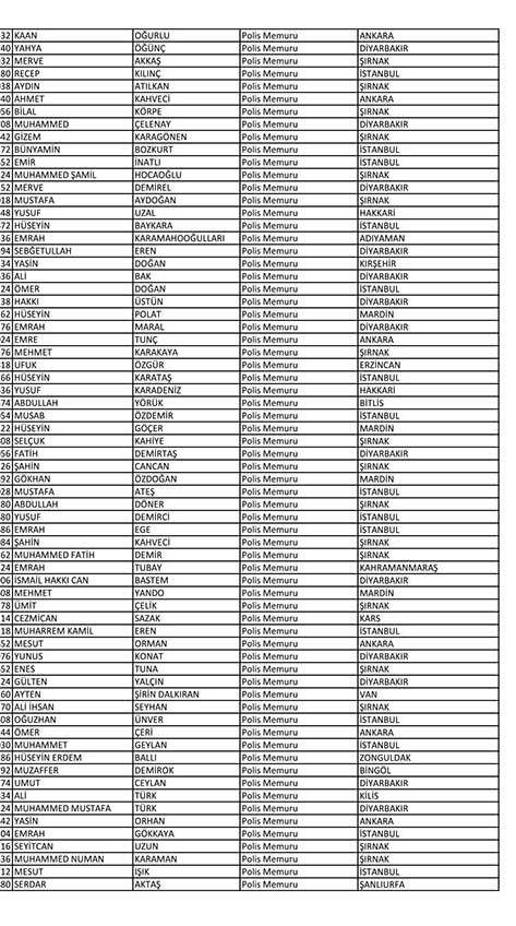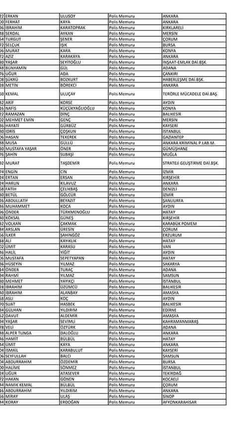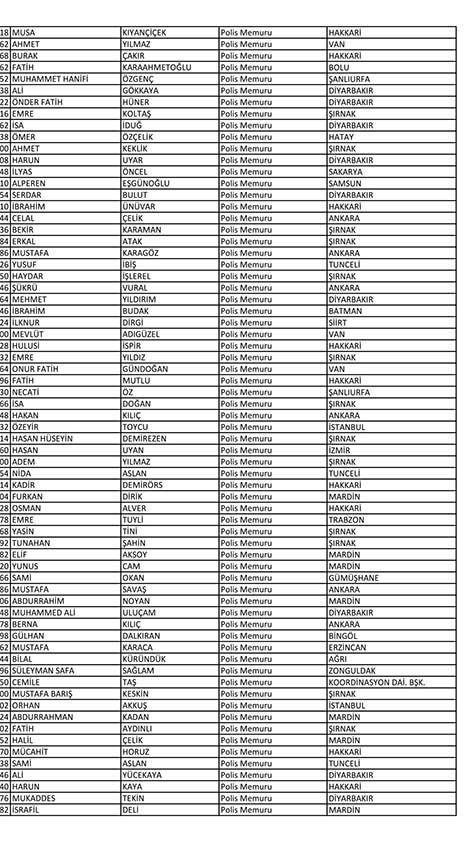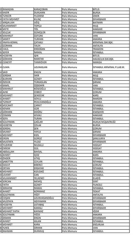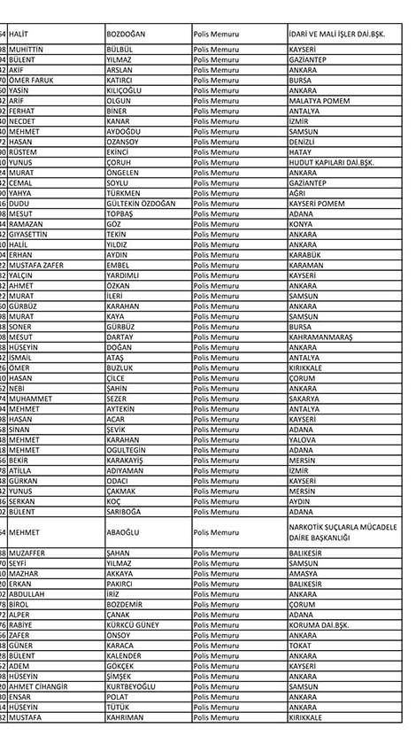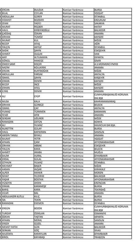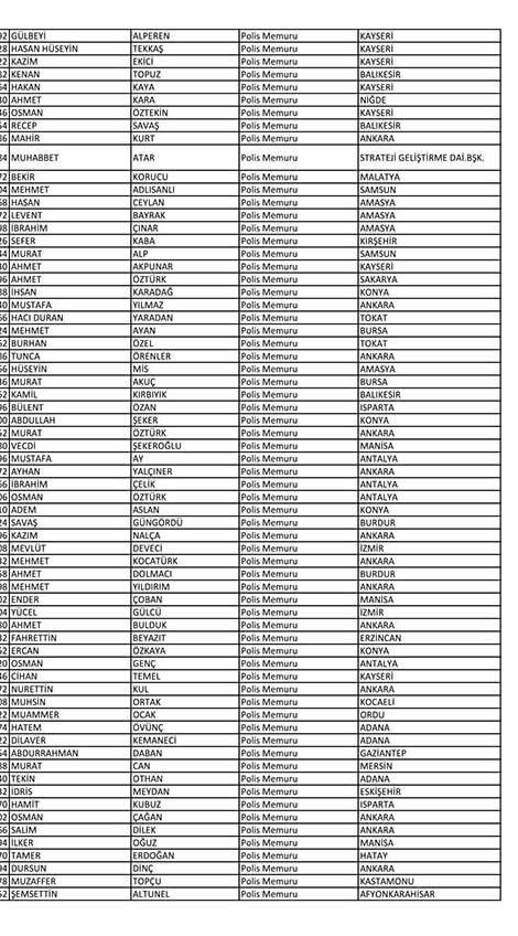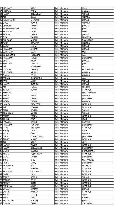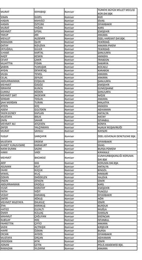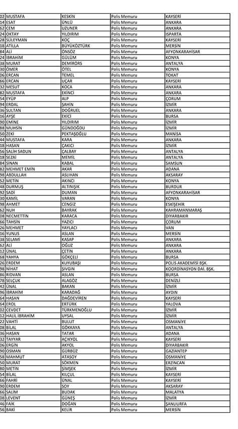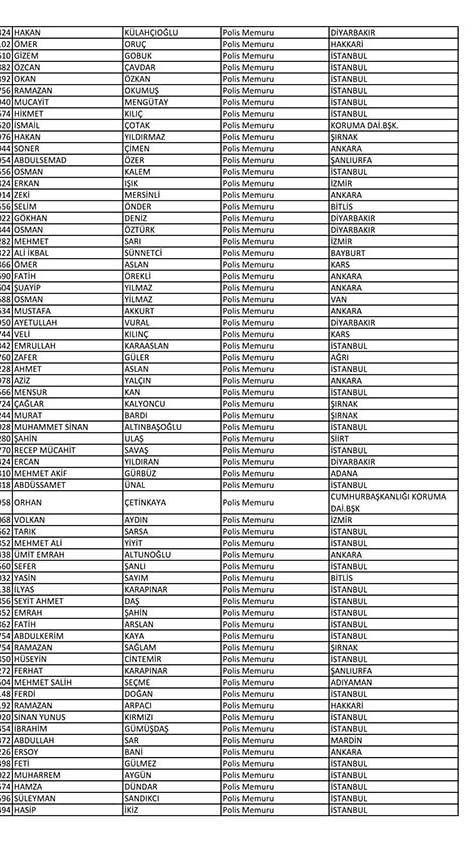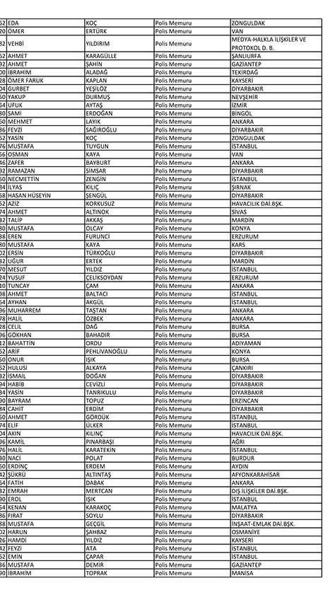 Emniyet Genel Müdürlüğü’nün kararıyla açığa alınan 9 bin 103 polisin isimleri belli oldu. Açığa alınanlardan 115’i emniyet müdürü. Listede 60 emniyet amiri de bulunuyor. Polislerden 2 bin 500’ü İstanbul’da bin 350’si Ankara’da görev yapıyordu. İşte il il açığa alınan polislerin tam listesi.