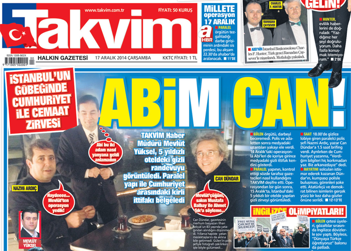 Eski imtiyaz sahibi merhum İlhan Selçuk, gözaltına alındı. Yazarı Mustafa Balbay, 4 yıl hapis yattı. Binasına bomba atıldı… İşte Gülen’in manşet lobisinde yer alan Cumhuriyet’in şimdiki yazarı Can Dündar, hocasına hizmette sınır tanımadı. Ergenekon, Şike ve Gezi baskınlarını yapan eski emniyetçi Nazmi Ardıç’tan talimat alırken TAKVİM’e yakalandı!
