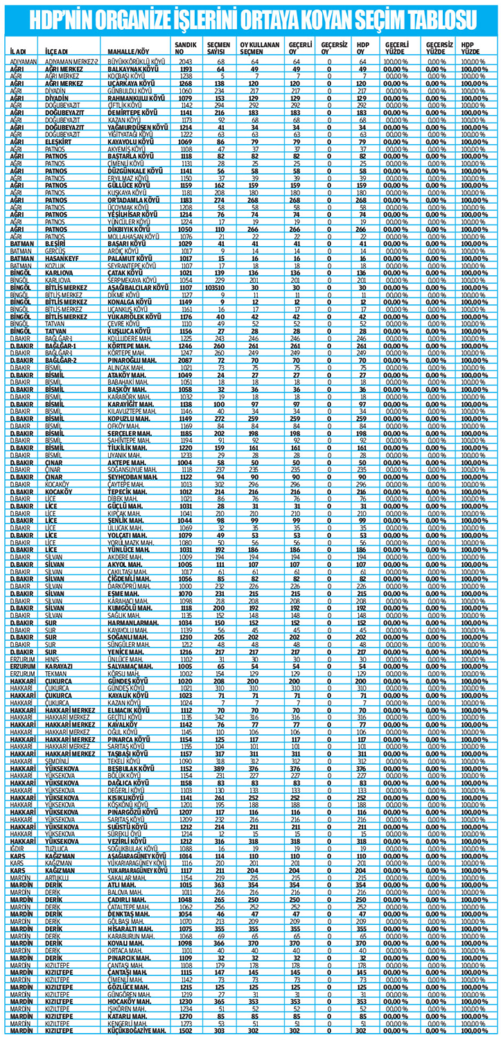 AKİT HDP’nin Türkiye geneli yapmış olduğu seçim hilesinin tam listesini yayınlıyor. Listelerdeki verilere göre HDP’nin 11 ilde seçimlere hile kattığı çok açık olarak gözüküyor. Öne çıkan köylerde kullanılan toplam oy oranları ve HDP’nin aldığı oy oranları şöyle; l Mardin’in Derik ilçesi Kavaklı Mahallesi; kullanılan toplam oy 370, geçerli oy sayısı 370, HDP 370, Diğer 0. lHakkâri’nin Yüksekova ilçesine bağlı Vezirli Köyü; kullanılan toplam oy 318, geçerli oy sayısı 318, HDP 318, Diğer 0. lDiyarbakır’ın Kocaköy ilçesine bağlı Çaytepe Köyü; kullanılan toplam oy 296, geçerli oy sayısı 296, HDP 296, Diğer 0. lAğrı Doğubayazıt Çiftlik Köyü, kullanılan toplam oy 292, geçerli oy sayısı 292, HDP 292, Diğer 0. lKars Kağızman Yukarı Karagüney Köyü, kullanılan toplam oy 204, geçerli oy sayısı 204, HDP 204, Diğer 0. lBingöl Karlıova Serpmekaya Köyü, kullanılan toplam oy 201, geçerli oy sayısı 201, HDP 201, Diğer 0. lErzurum Tekman Körsu Mahallesi, kullanılan toplam oy 129, geçerli oy sayısı 129, HDP 129, Diğer 0