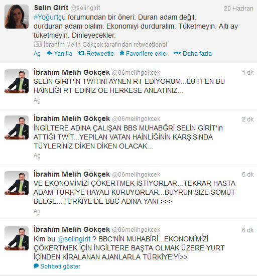 Ankara Büyükşehir Belediye Başkanı Melih Gökçek, Twitter hesabından BBC Muhabiri Selin Girit’e yüklendi. Gökçek, şoke eden tweetlerini paylaştığı Girit için “Vatan haini” ifadesini kullandı.