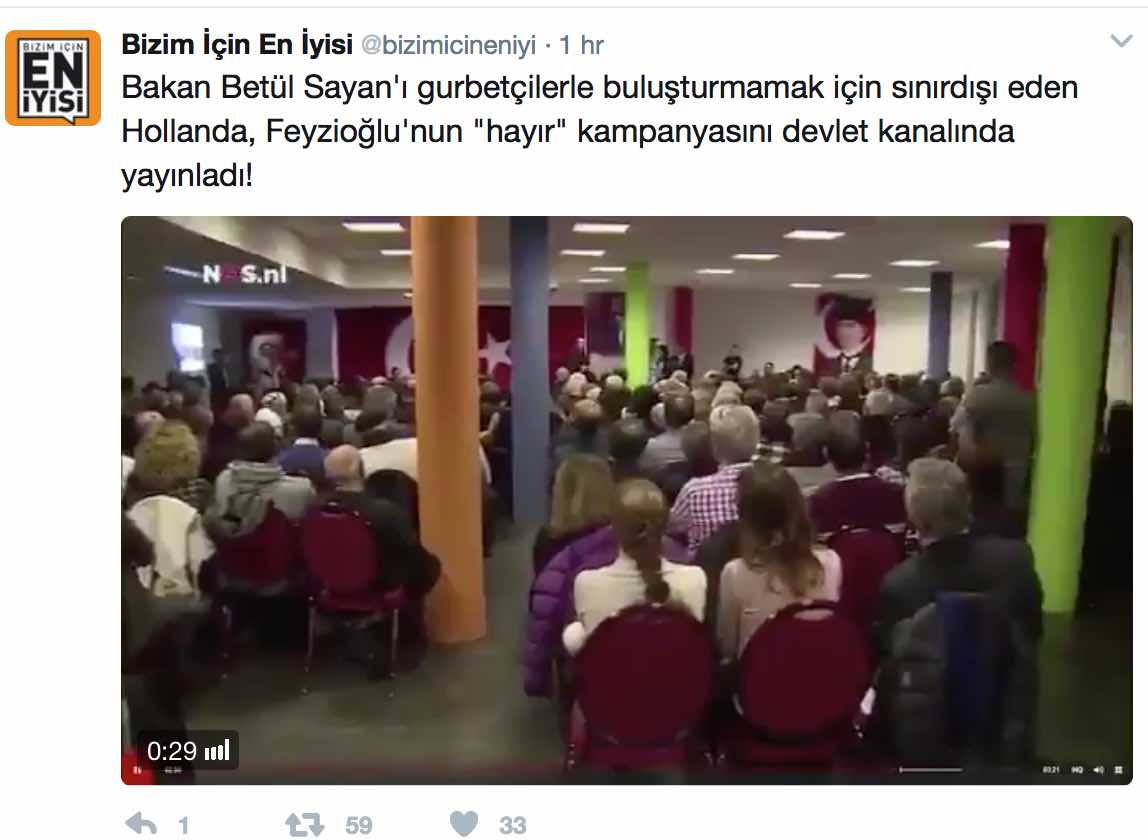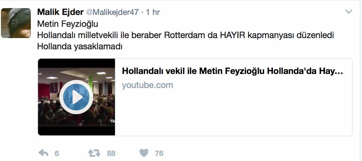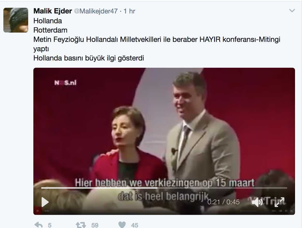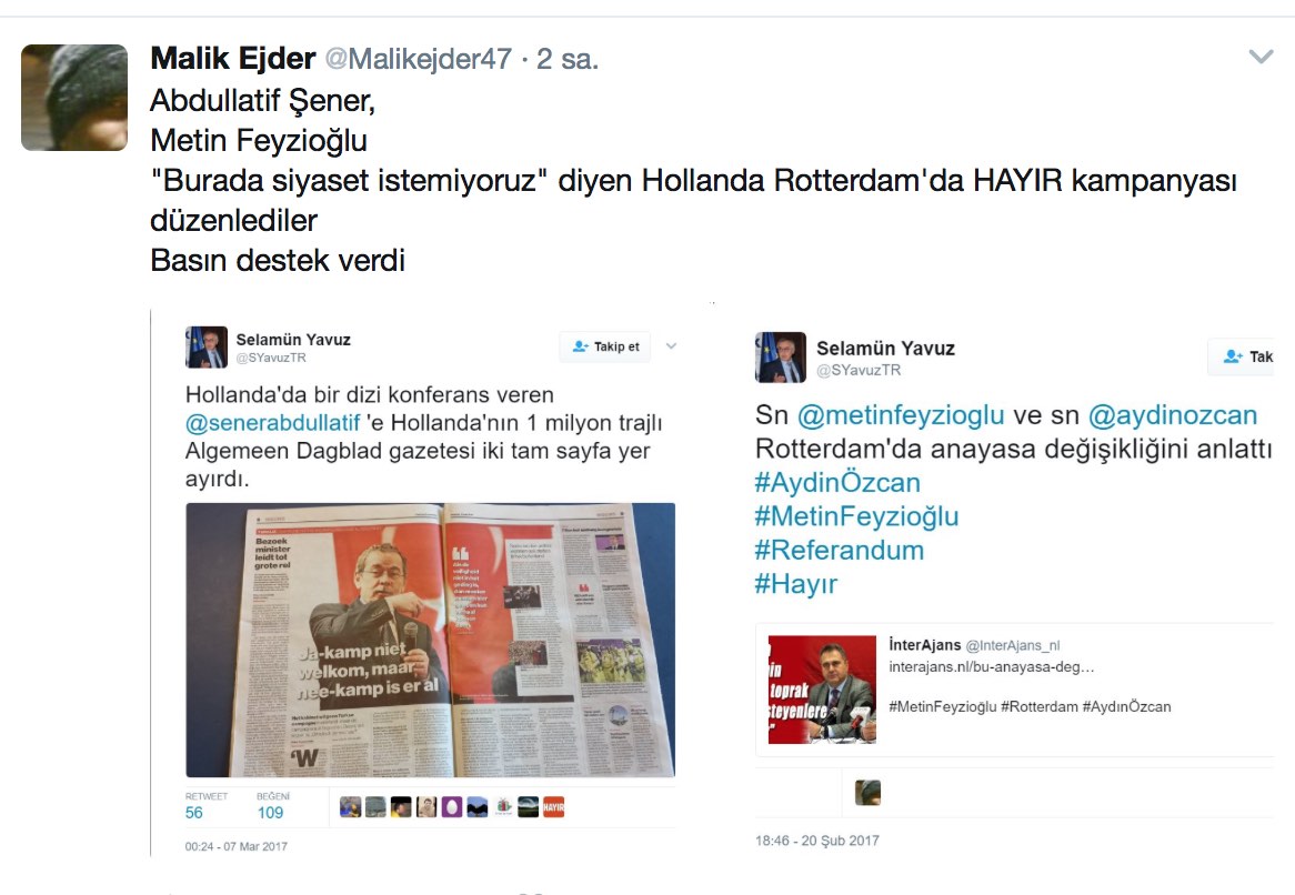 İnsanlık adına yüz karası bir uygulamaya imza atarak, genlerindeki Nazizm ve faşizmi hortlatan Hollanda, Türkiye Cumhuriyeti’nin Aile ve Sosyal Politikalar Bakanı Fatma Betül Sayan Kaya’nın Türk vatandaşlarıyla buluşmasına “seçim faaliyeti yasak” bahanesiyle engel olurken, hayırcılara sonuna kadar destek verdi. Hayır cephesinden Abdüllatif Şener ile Türkiye Barolar Birliği Başkanı Metin Feyzioğlu’nun Hollanda devletinin desteğiyle hayır propagandası yaptığı ve Hollanda devlet televizyonunu Nos TV’nin Feyzioğlu’nun konuşmasını yayınladığı ortaya çıktı. İşte Hollanda’nın çifre standardının bir başka yüzü…
