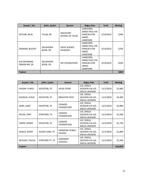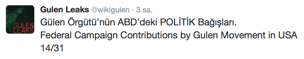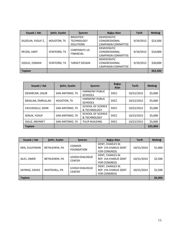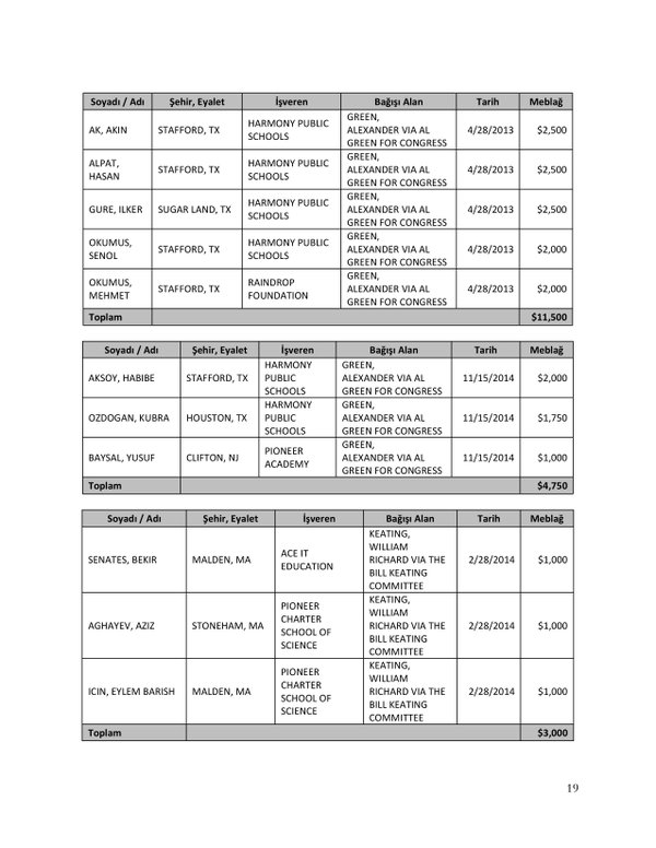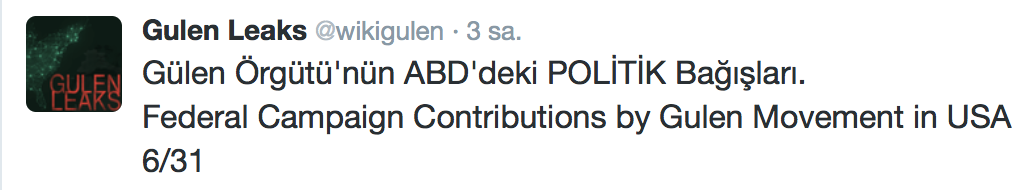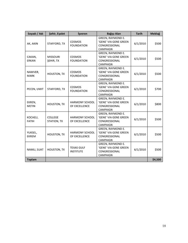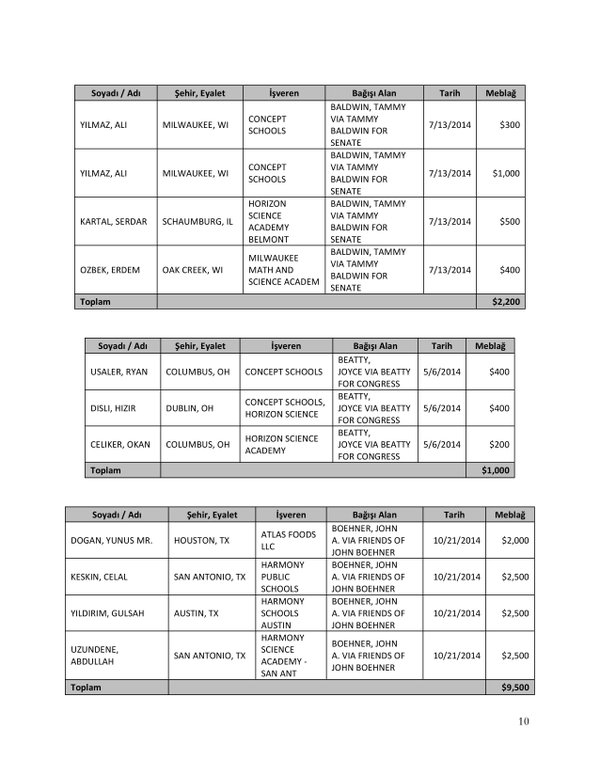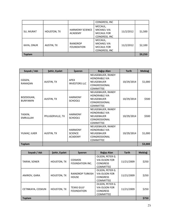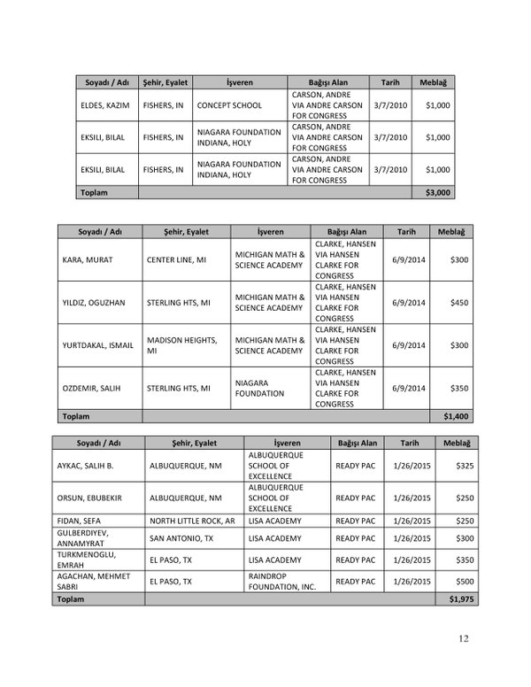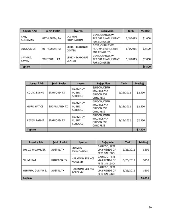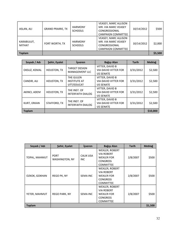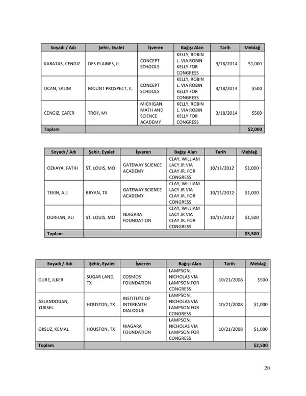 FETÖ’nün ABD kongresine yaptığı bağışlar Twitter’da @wikigulen adresinde paylaşıldı. Sürekli Türkiye aleyhine açıklamalar yapan ABD kongresi üyelerinin FETÖ tarafından himmet paralarıyla finanse edildiği ortaya çıktı. FETÖ’ye destek mesajları veren ABD kongresi üyelerinin FETÖ üyesi isimler tarafından paraya boğulduğu belgelendi.İşte FETÖ’nün himmetle paraya boğduğu ABD kongre üyeleri…