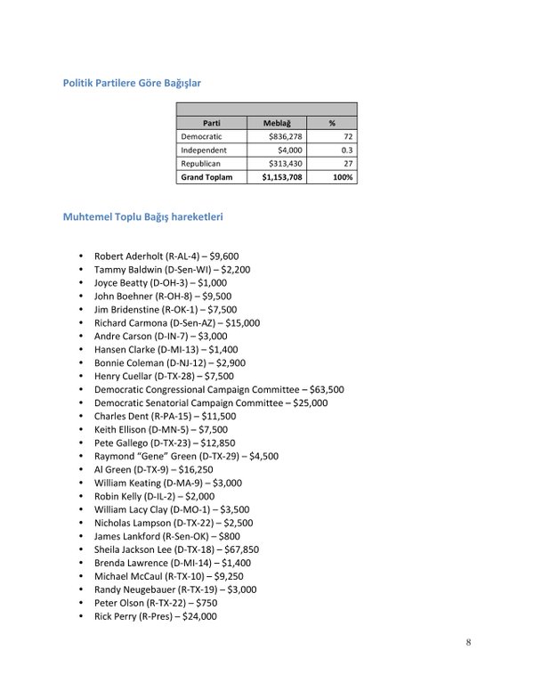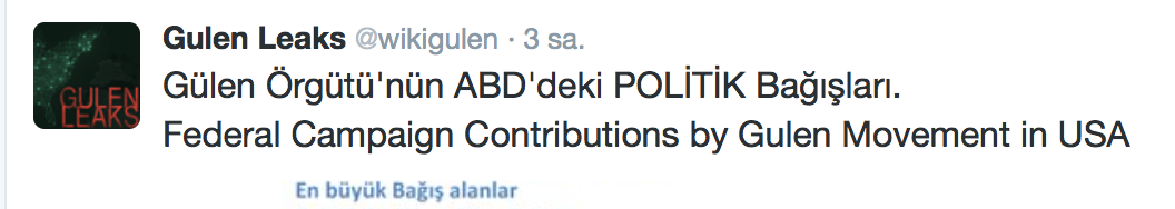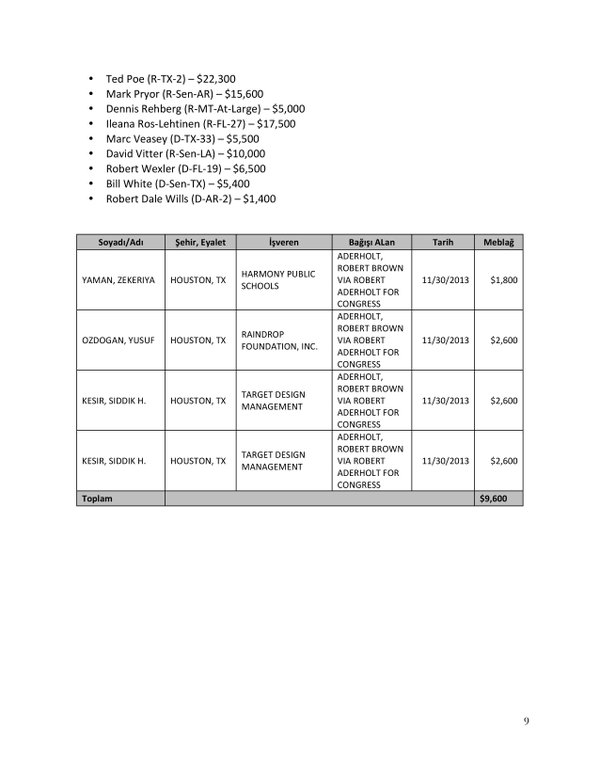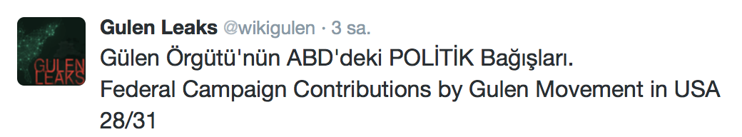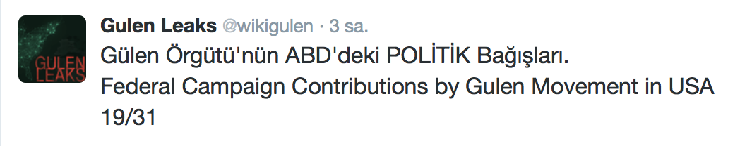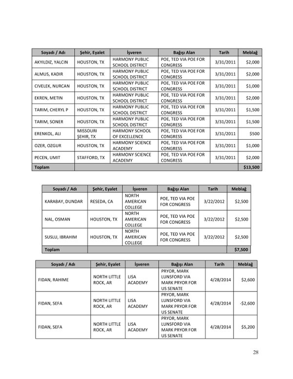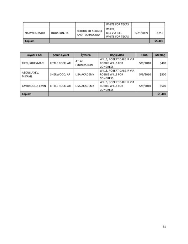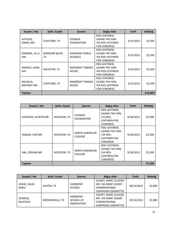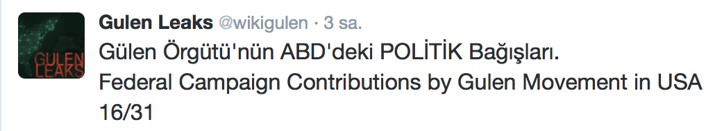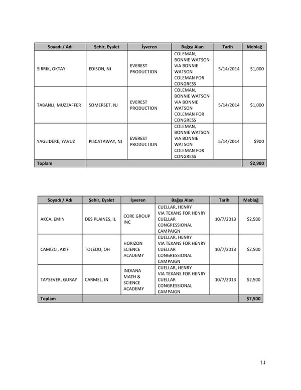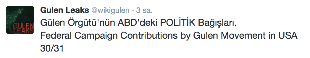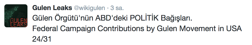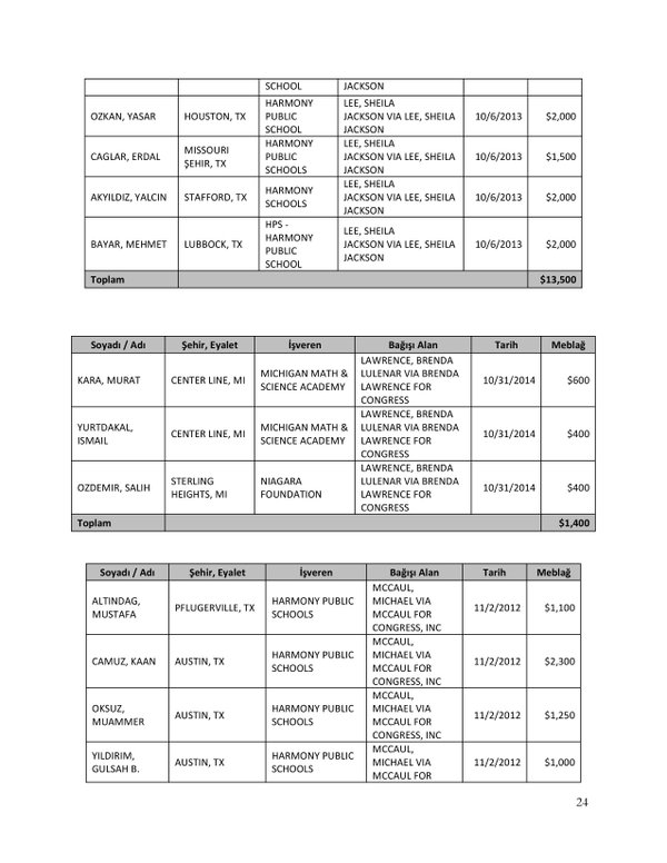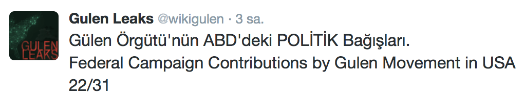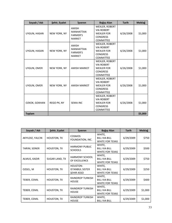 FETÖ’nün ABD kongresine yaptığı bağışlar Twitter’da @wikigulen adresinde paylaşıldı. Sürekli Türkiye aleyhine açıklamalar yapan ABD kongresi üyelerinin FETÖ tarafından himmet paralarıyla finanse edildiği ortaya çıktı. FETÖ’ye destek mesajları veren ABD kongresi üyelerinin FETÖ üyesi isimler tarafından paraya boğulduğu belgelendi.İşte FETÖ’nün himmetle paraya boğduğu ABD kongre üyeleri…