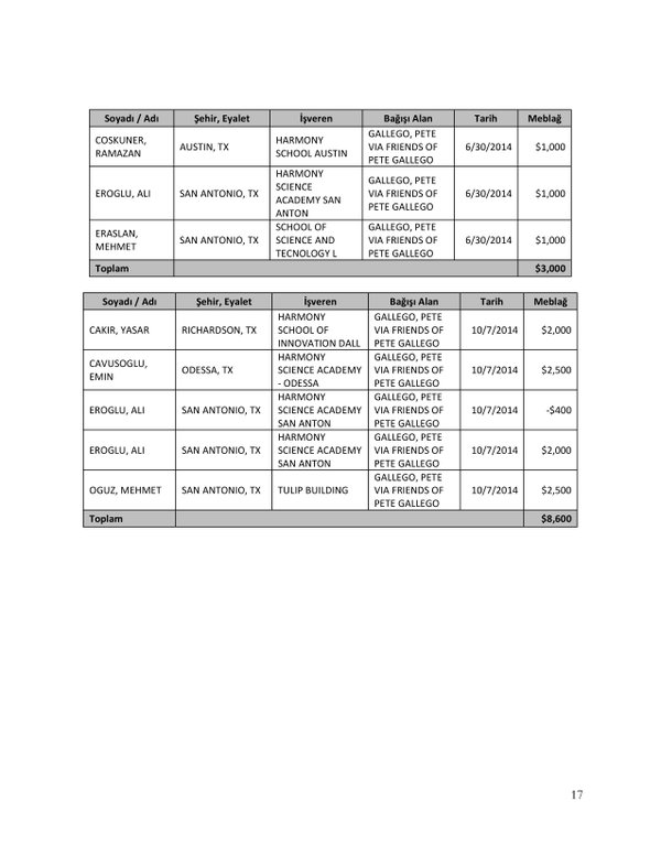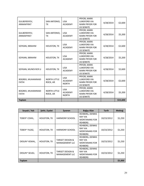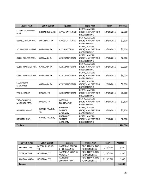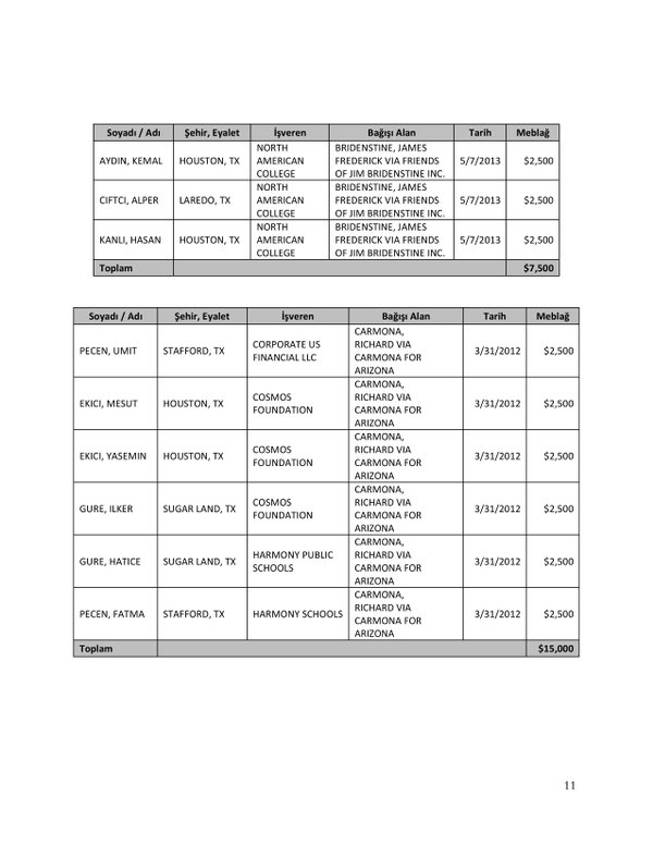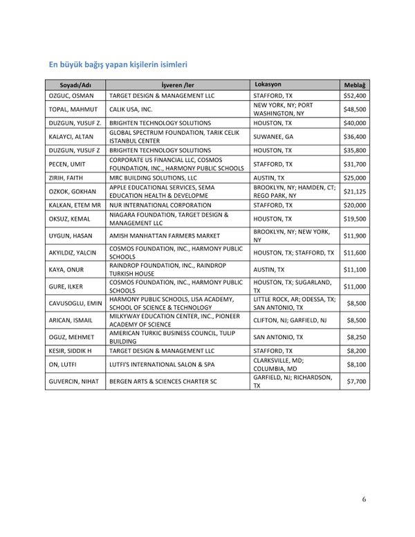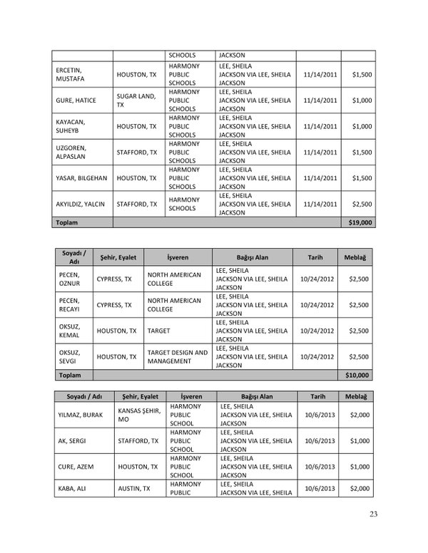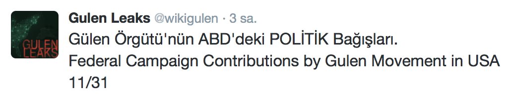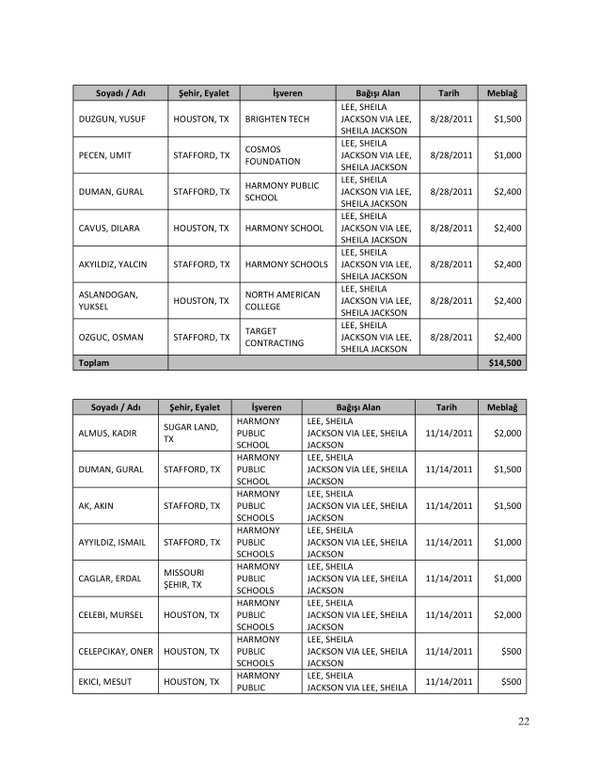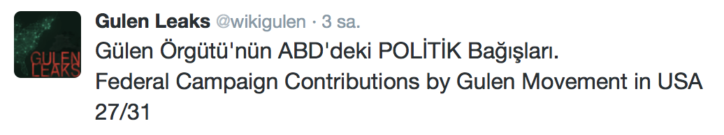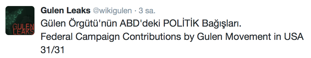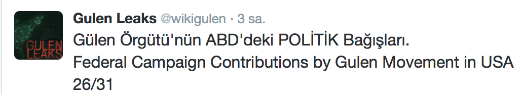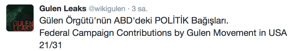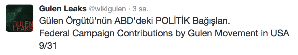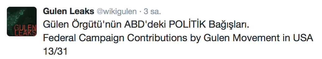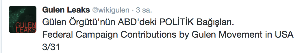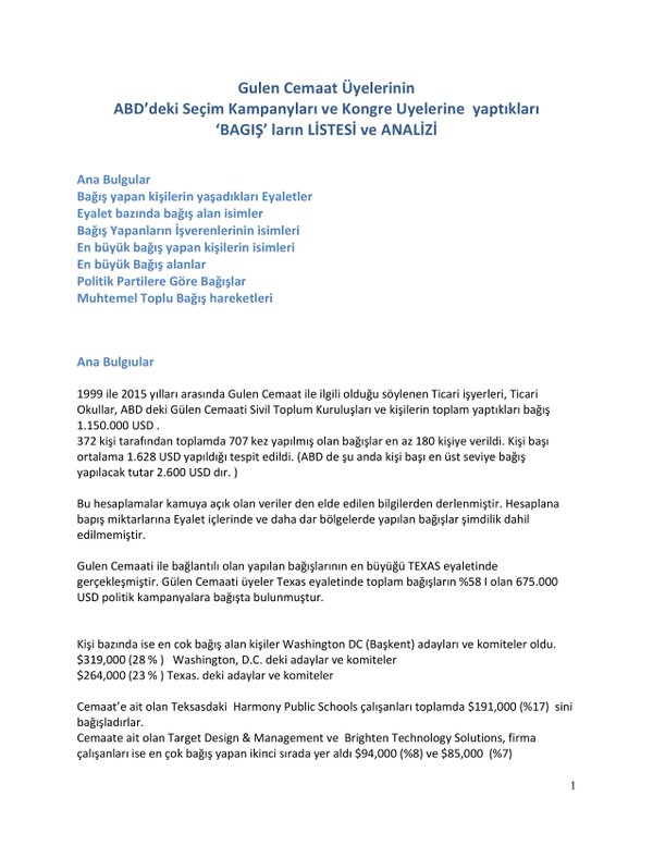 FETÖ’nün ABD kongresine yaptığı bağışlar Twitter’da @wikigulen adresinde paylaşıldı. Sürekli Türkiye aleyhine açıklamalar yapan ABD kongresi üyelerinin FETÖ tarafından himmet paralarıyla finanse edildiği ortaya çıktı. FETÖ’ye destek mesajları veren ABD kongresi üyelerinin FETÖ üyesi isimler tarafından paraya boğulduğu belgelendi.İşte FETÖ’nün himmetle paraya boğduğu ABD kongre üyeleri…