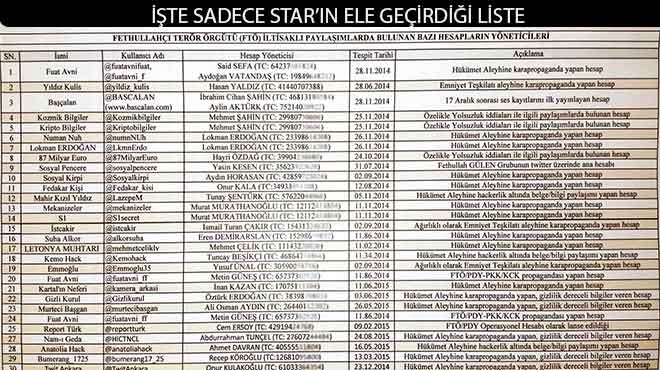 Devletin mahrem bilgileri, siyasetçi ve kamu yöneticilerinin özel hayatlarına kadar her türlü bilgi ve illegal görüntüleri paylaşan FETÖ’nün psikolojik harekât hesaplarının yöneticileri tek tek belirlendi. İstanbul Cumhuriyet Başsavcılığı Terörle Mücadele Bürosu’nun yürüttüğü soruşturma kapsamında yapılan çalışmalar sonucu Emniyet Genel Müdürlüğü Siber Suçlarla Mücadele Şubesi, ülkenin birlik ve beraberliğini bozmak amacıyla trol hesaplar üzerinden yapılan paylaşımların ardındaki gerçek isimleri tek tek belirledi. FETÖ’nün trol ordusunun gerçek kullanıcılarından oluşan 30 kişilik listede baş trol ‘Fuat Avni’den, 17 Aralık’tan yargı darbesi girişiminden sonra ilk kez montajlı ses kayıtlarını yayınlayan ‘Başçalan’a, FETÖ ile mücadele eden emniyet mensuplarını tehdit edip iftira atan ‘Yıldız Kulis’ hesabına kadar örgütün karanlık sanal timin bilgilerine ulaşıldı. FETÖ’nün baş trolü ‘Fuat Avni’nin arkasındaki ismin Aydoğan Vatandaş olduğunu ilk kez kamuoyuyla paylaşan Star, şimdi de diğer tüm hesapların gerçek kullanıcılarını deşifre ediyor.