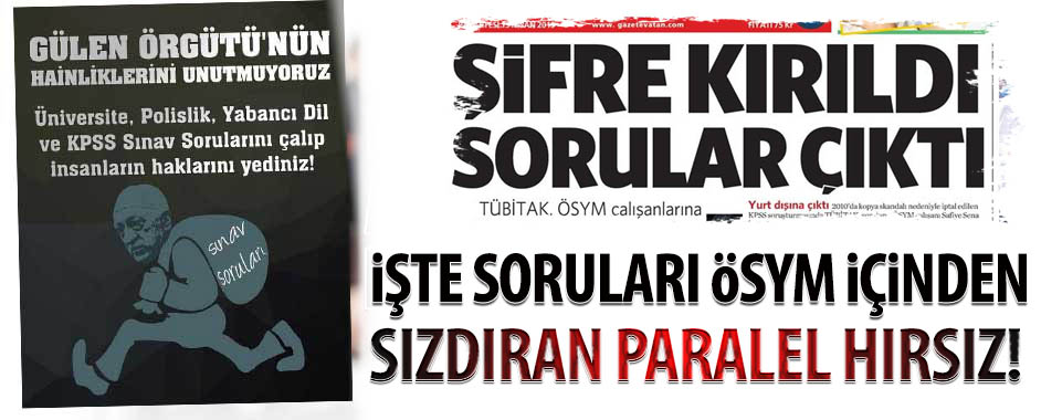 Gülen terör örgütünün nasıl sınav sorularını çaldığına dair bomba detaylar bugün iki gazetenin manşetinde yer aldı.ç Vatan gazetesi ÖSYM’de çalışan ve soruları sızdıran Fetullahçı hırsızın adnı kodlayarak yayınlamıştı. Yeni Akit ise çok daha çarpıcı bilgilerle o hırsızın Fetullahçı üniversitede görev yaptığını ve tam adını açıkladı. İşte kaçak paralel hırsız Safiye Sena İz Açıkgöz ile ilgili Akit’in haberi: