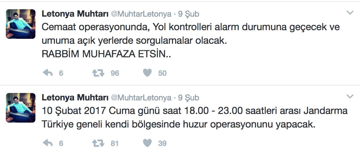 Emniyet Genel Müdürlüğü, Jandarma Genel Komutanlığı ve Sahil Güvenlik Komutanlığı ekipleri 80 bin görevli ile ülke genelinde “güven ve huzur” denetimleri yapıyor. Ancak dün FETÖ’nün yurtdışındaki terörist bir hesabından bugünkü 81 ildeki operasyonla ilgili paylaşım, Fetullahçı teröristlerin halen Emniyet ve Jandarma’da etkin olduklarını gösterdi.