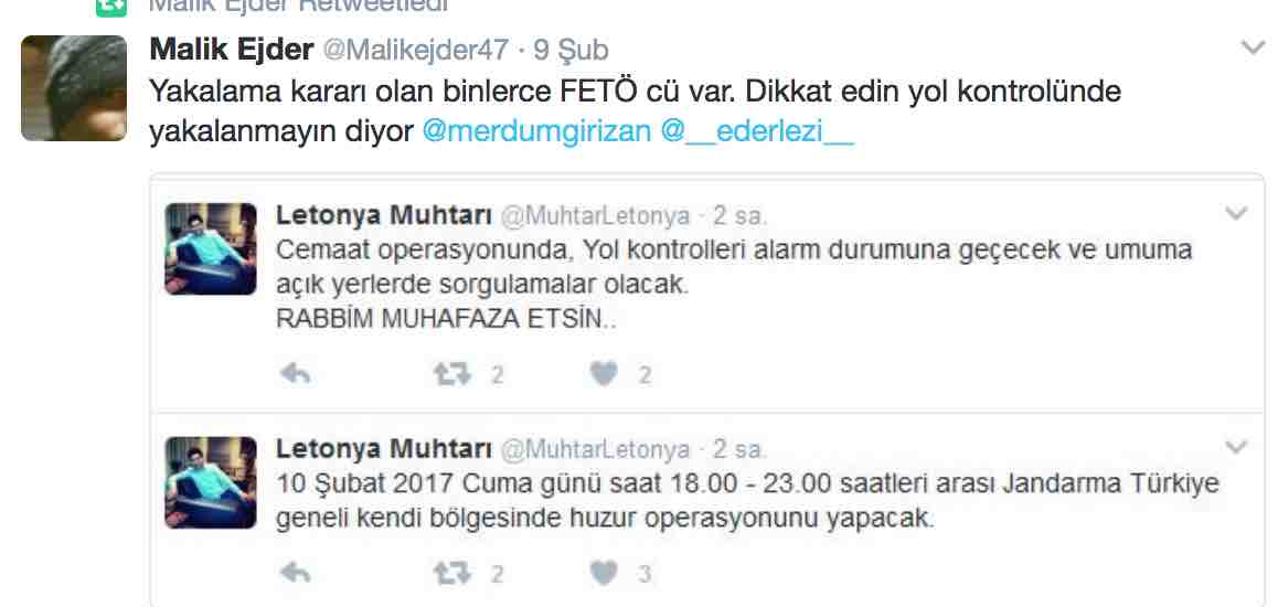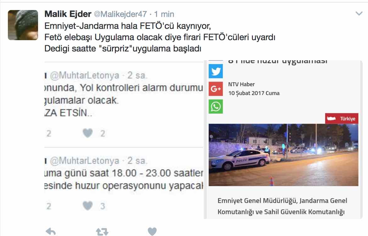Dün yurtdışındaki FETÖ’cü terörist bir hesaptan bugünkü yol kontrolleri operasyonunun haberi verildi. Sözkonusu hesap, FETÖ’cü kaçakları operasyonlara karşı uyardı. Operasyondan FETÖ’nün böyle haberdar olması, Emniyet ve Jandarma içinde halen FETÖ’cülerin aktif olduğunu gösterdi.