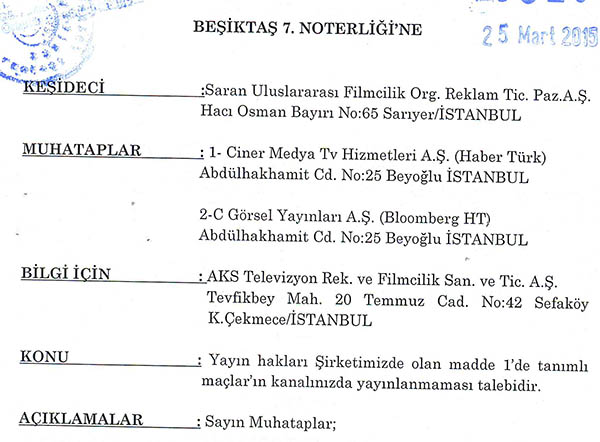 İşte bundan dolayı Ciner Medya Grubu devreye girerek maçların Habertürk TV’de yayınlanması için harekete geçti. Saran Medya bunun haberini alır almaz Ciner Medya Grubu’na çektiği bir ihtarname ile bunu engelledi.