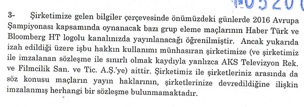 Bildirim tarihinden itibaren söz konusu milli maçların başka bir televizyon kanalında yayınlanması ile ilgili olarak ise Show TV açısından ya da Show TV’den kaynaklanan herhangi bir engel bulunmamaktadır.